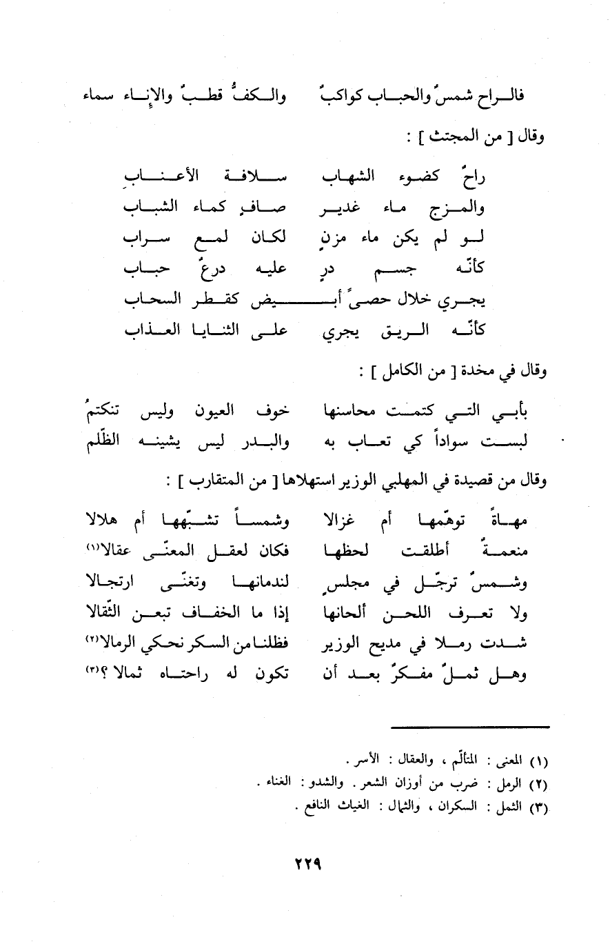 (فالراح شمس والحباب كواكب ... والكف قطب والاناء سَمَاء) // الْكَامِل //