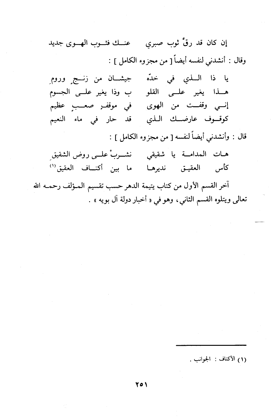 آخر الْقسم الاول من كتاب يتيمة الدَّهْر حسب تَقْسِيم الْمُؤلف رَحمَه الله تَعَالَى ويتلوه الْقسم الثَّانِي وَهُوَ فِي اخبار دولة آل بويه