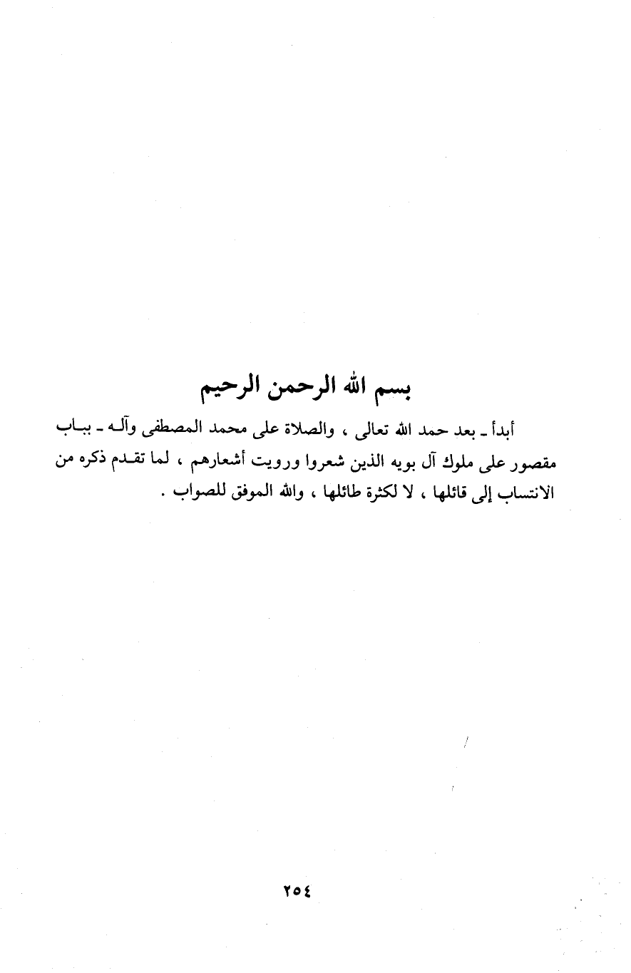 أبدأ بعد حمد الله تَعَالَى وَالصَّلَاة على مُحَمَّد الْمُصْطَفى وَآله بِبَاب مَقْصُور على مُلُوك آل بويه الَّذِي شعروا وَرويت أشعارهم لما تقدم ذكره من الانتساب إِلَى قَائِلهَا لَا لِكَثْرَة طائلها وَالله الْمُوفق للصَّوَاب
