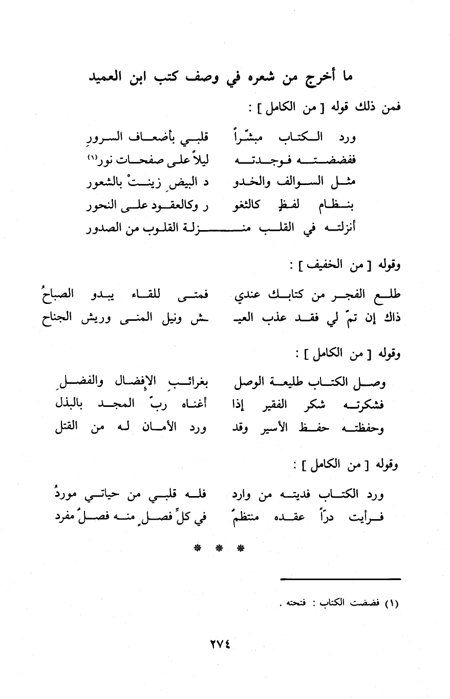 مَا أخرج من شعره فِي وصف كتب ابْن العميد