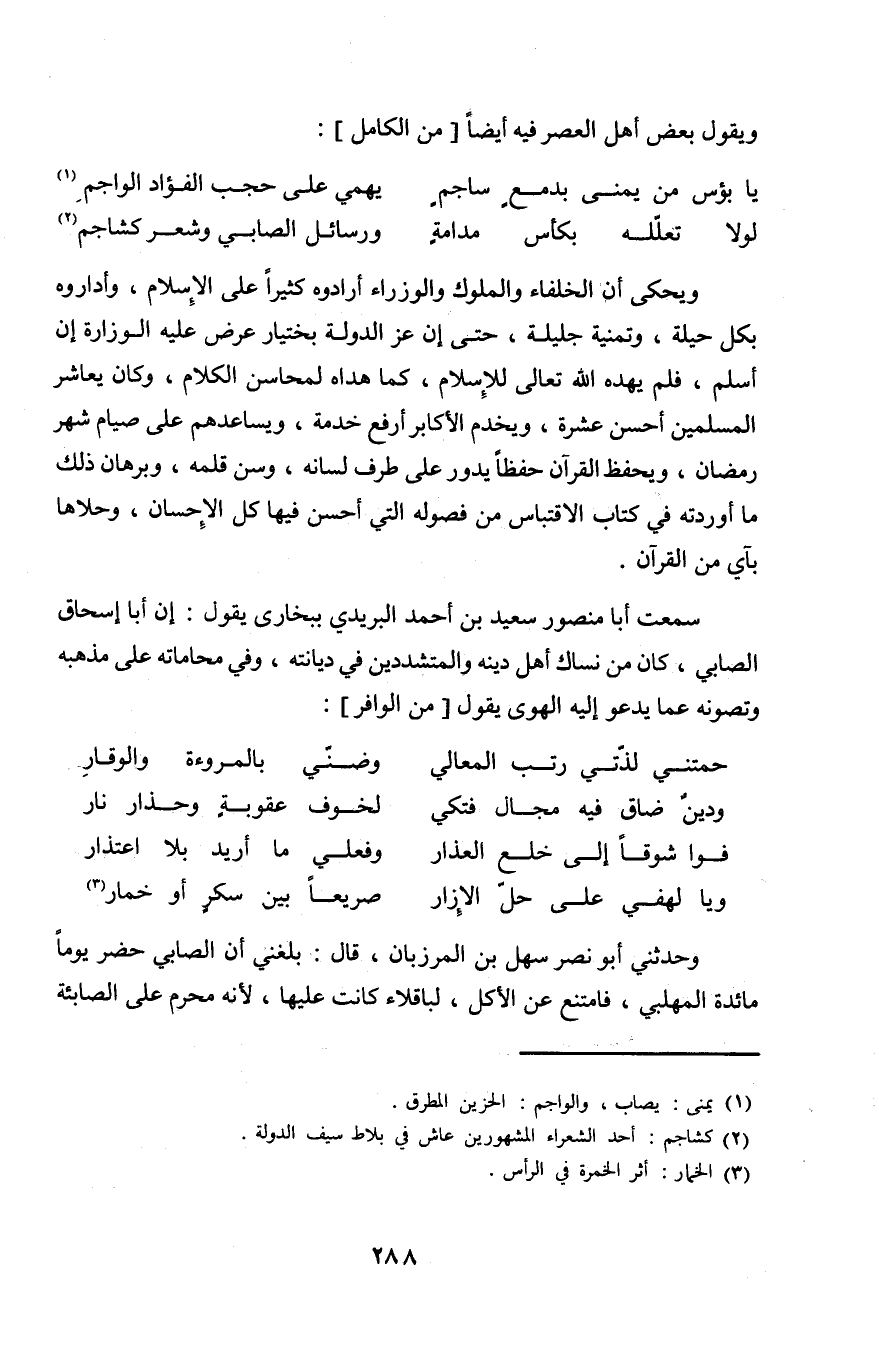 سَمِعت أَبَا مَنْصُور سعيد بن احْمَد البريدي ببخارى يَقُول إِن أَبَا إِسْحَاق الصابي كَانَ من نساك أهل دينه والمتشددين فِي ديانته وَفِي محاماته على مذْهبه وتصونه عَمَّا يَدْعُو إِلَيْهِ الْهوى يَقُول من الوافر