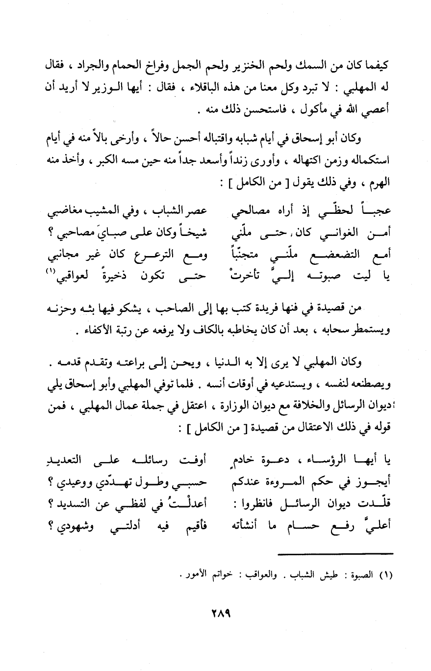 وَكَانَ المهلبي لَا يرى إِلَّا بِهِ الدُّنْيَا ويحن الى براعته وَتقدم قدمه ويصطنعه لنَفسِهِ ويستدعيه فِي أَوْقَات انسه فَلَمَّا توفّي المهلبي وَأَبُو إِسْحَاق يَلِي ديوَان الرسائل والخلافة مَعَ ديوَان الوزارة اعتقل فِي جملَة عُمَّال المهلبي فَمن قَوْله فِي ذَلِك الاعتقال من قصيدة من الْكَامِل