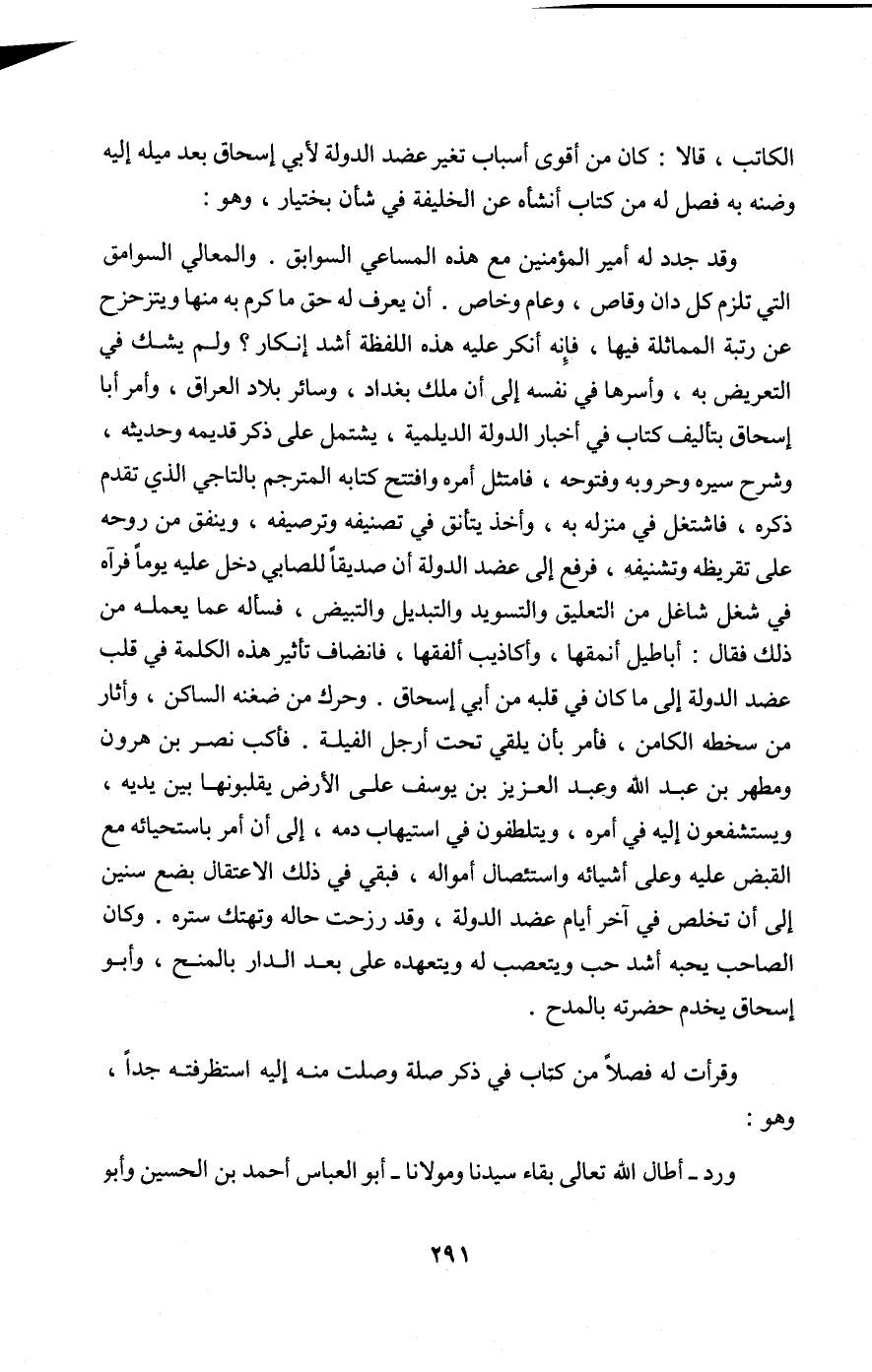 الْكَاتِب قَالَا كَانَ من اقوى اسباب تغير عضد الدولة لابي إِسْحَاق بعد ميله إِلَيْهِ وضنه بِهِ فصل لَهُ من كتاب أنشأه عَن الْخَلِيفَة فِي شَأْن بختيار وَهُوَ