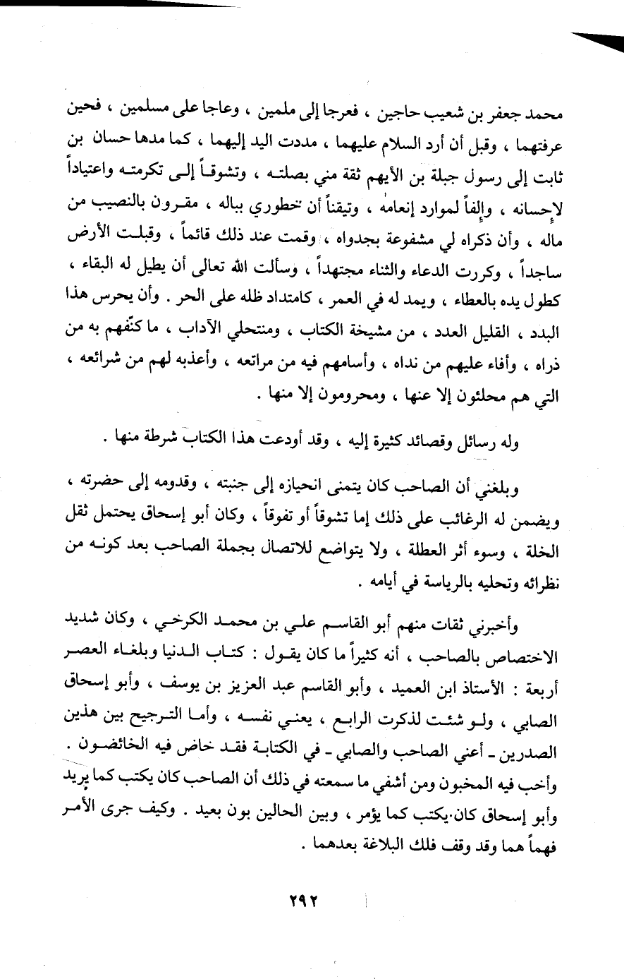 مُحَمَّد جَعْفَر بن شُعَيْب حاجين فعرجا الى ملمين وعاجا على مُسلمين فحين عرفتهما وَقبل أَن ارد السَّلَام عَلَيْهِمَا مددت الْيَد إِلَيْهِمَا كَمَا مدها حسان بن ثَابت الى رَسُول جبلة بن الايهم ثِقَة مني بصلته وتشوقا الى تكرمته واعتيادا لاحسانه وإلفا لموارد إنعامه وتيقنا أَن خطوري بِبَالِهِ مقرون بالنصيب من مَاله وَأَن ذكرَاهُ لي مشفوعة بجدواه وَقمت عِنْد ذَلِك قَائِما وَقبلت الارض سَاجِدا وكررت الدُّعَاء وَالثنَاء مُجْتَهدا وَسَأَلت الله تَعَالَى ان يُطِيل لَهُ الْبَقَاء كطول يَده بالعطاء ويمد لَهُ فِي الْعُمر كامتداد ظله على الْحر وَأَن يحرس هَذَا البدد الْقَلِيل الْعدَد من مشيخة الْكتاب ومنتحلي الاداب مَا كنفهم بِهِ من ذراه وافاء عَلَيْهِم من نداه واسامهم فِيهِ من مراتعه وأعذبه لَهُم من شرائعه الَّتِي هم محلئون إِلَّا عَنْهَا ومحرومون إِلَّا مِنْهَا