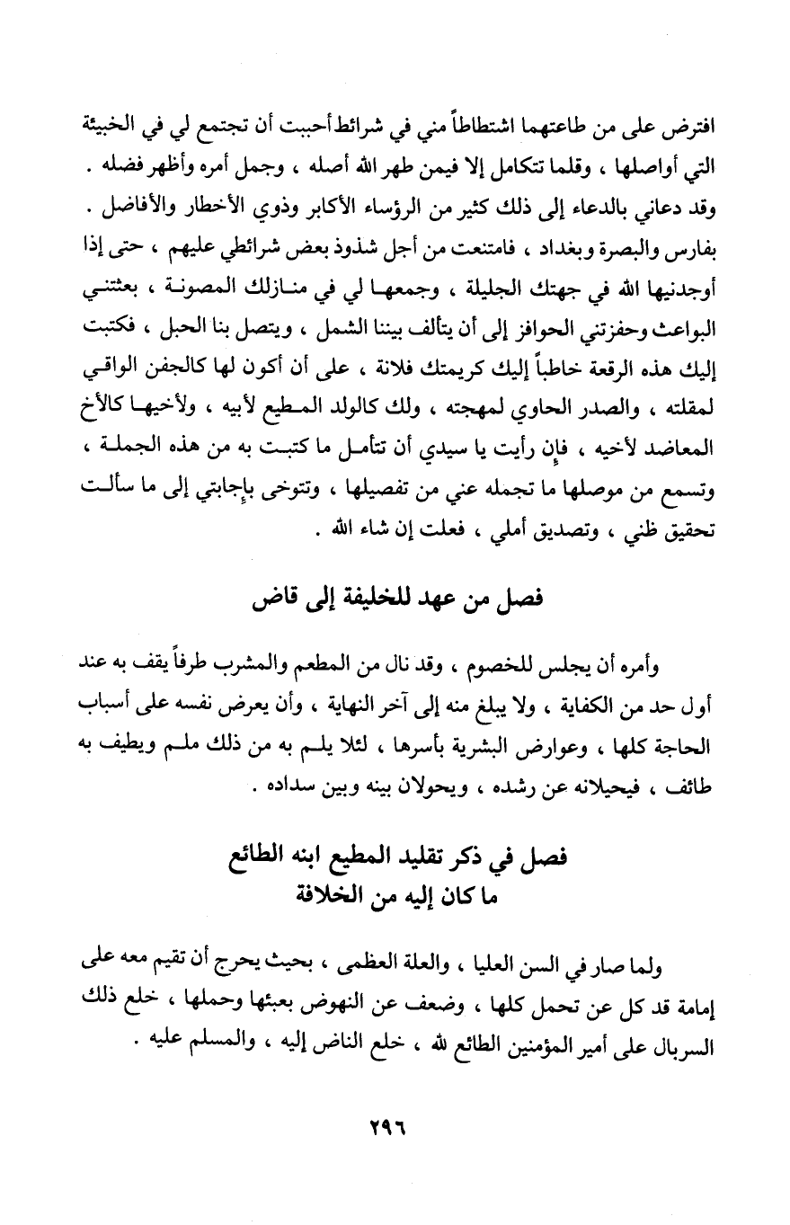 افْترض على من طاعتهما اشتطاطا مني فِي شَرَائِط أَحْبَبْت ان تَجْتَمِع لي فِي الخبيثة الَّتِي أواصلها وقلما تتكامل إِلَّا فِيمَن طهر الله أَصله وجمل أمره وَأظْهر فَضله وَقد دَعَاني بِالدُّعَاءِ الى ذَلِك كثير من الرؤساء الاكابر وَذَوي الاخطار والافاضل بِفَارِس وَالْبَصْرَة وبغداد فامتنعت من اجل شذوذ بعض شرائطي عَلَيْهِم حَتَّى اذا أوجدنيها الله فِي جهتك الجليلة وَجَمعهَا لي فِي منازلك المصونة بعثتني البواعث وحفزتني الحوافز الى ان يتألف بَيْننَا الشمل ويتصل بِنَا الْحَبل فَكتبت إِلَيْك هَذِه الرقعة خاطبا إِلَيْك كريمتك فُلَانَة على أَن أكون لَهَا كالجفن الواقي لمقلته والصدر الْحَاوِي لمهجته وَلَك كَالْوَلَدِ الْمُطِيع لابيه ولاخيها كالاخ المعاضد لاخيه فَإِن رَأَيْت يَا سَيِّدي أَن تتأمل مَا كتبت بِهِ من هَذِه الْجُمْلَة وَتسمع من موصلها مَا تجمله عني من تفصيلها وتتوخى بإجابتي الى مَا سَأَلت تَحْقِيق ظَنِّي وتصديق أملي فعلت إِن شَاءَ الله