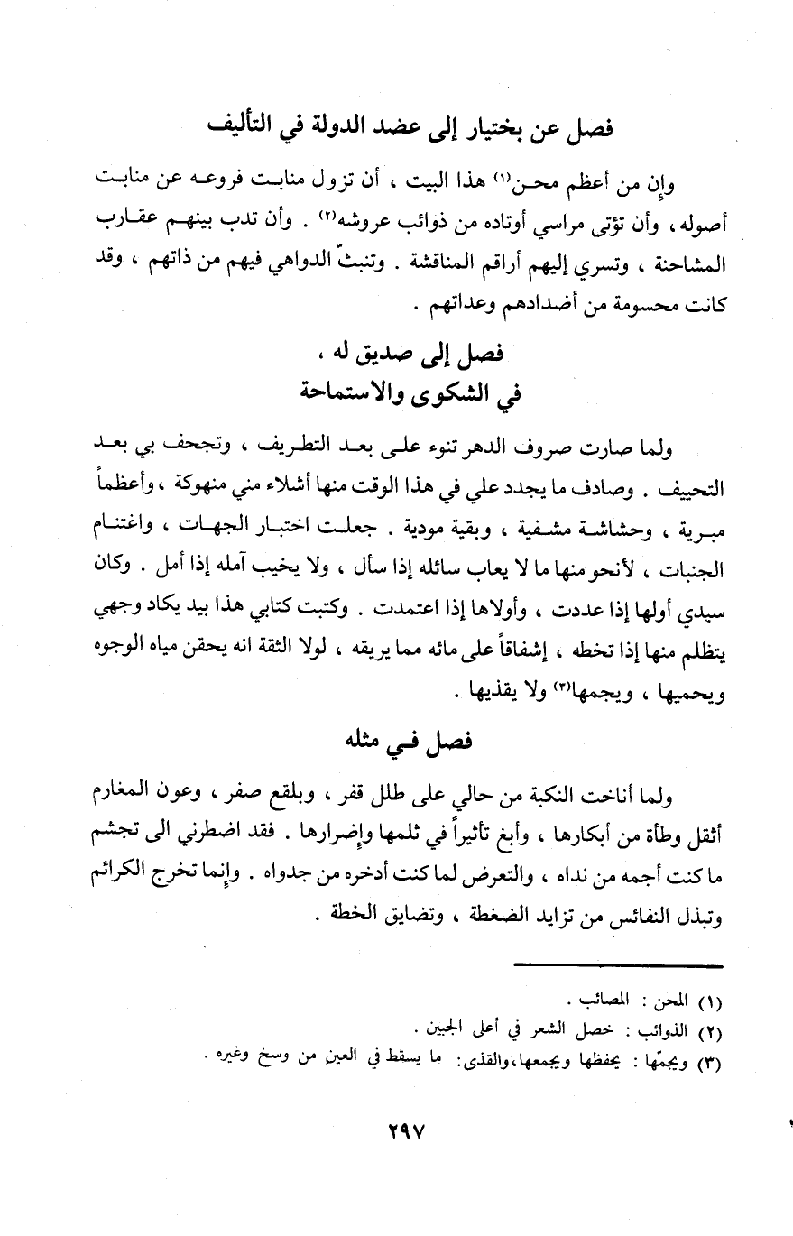 وَلما صَارَت صروف الدَّهْر تنوء على بعد التطريف وتجحف بِي بعد التحييف وصادف مَا يجدد عَليّ فِي هَذَا الْوَقْت مِنْهَا اشلاء مني منهوكة وأعظما مبرية وحشاشة مشفية وَبَقِيَّة مودية جعلت اختبار الْجِهَات واغتنام الجنبات لانحو مِنْهَا مَا لَا يعاب سائله إِذا سَأَلَ وَلَا يخيب أمله إِذا أمل وَكَانَ سَيِّدي أَولهَا إِذا عددت وأولاها اذا اعتمدت وكتبت كتابي هَذَا بيد يكَاد وَجْهي يتظلم مِنْهَا إِذا تخطه إشفاقا على مَائه مِمَّا يريقه لَوْلَا الثِّقَة انه يحقن مياه الْوُجُوه ويحميها ويجمها وَلَا يقذيها