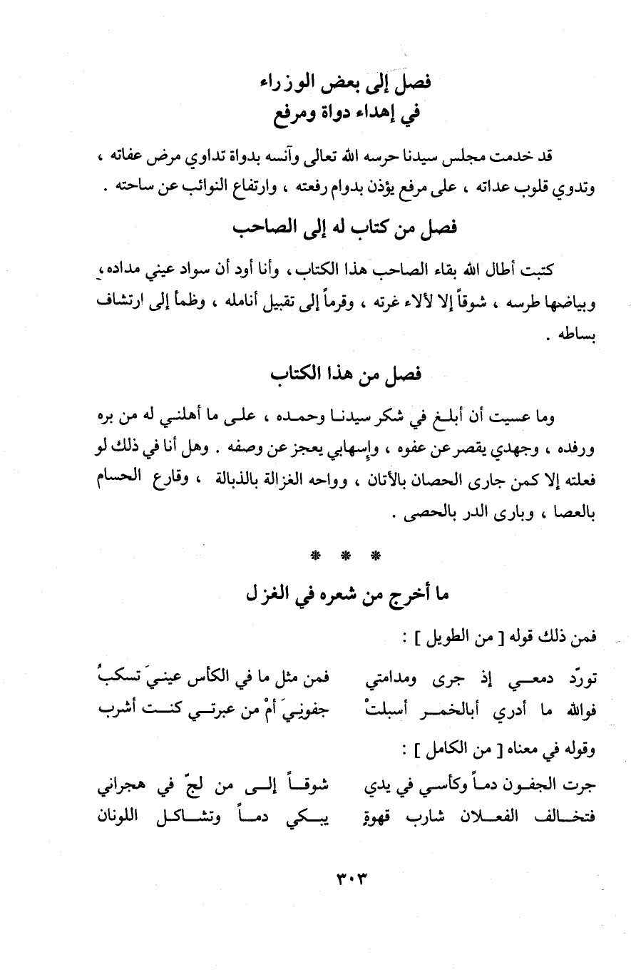 كتبت اطال الله بَقَاء الصاحب هَذَا الْكتاب وَأَنا أود ان سَواد عَيْني مدادة وبياضها طرسة شوقا إِلَّا لألاء غرته وقرما الى تَقْبِيل أنامله وظمأ الى ارتشاف بساطه