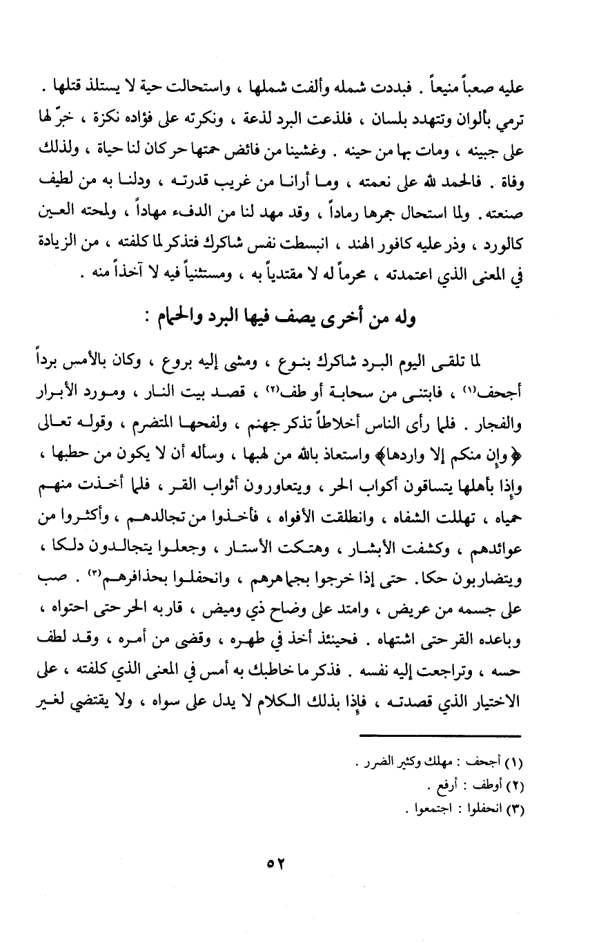 لما تلقى الْيَوْم الْبرد شاكرك بِنَوْع وَمَشى إِلَيْهِ بروع وَكَانَ بالامس بردا أجحف فابتنى من سَحَابَة أَو طف قصد بَيت النَّار ومورد الْأَبْرَار والفجار فَلَمَّا رأى النَّاس أخلاطا تذكر جَهَنَّم ولفحها المتضرم وَقَوله تَعَالَى {وَإِن مِنْكُم إِلَّا واردها} واستعاذ بِاللَّه من لهبها وَسَأَلَهُ أَن لَا يكون من حطبها وَإِذا بِأَهْلِهَا يتساقون أكواب الْحر ويتعاورون أَثوَاب القر فَلَمَّا أخذت مِنْهُم حمياه تهللت الشفاه وَانْطَلَقت الافواه فَأخذُوا من تجالدهم وَأَكْثرُوا من عوائدهم وكشفت الابشار وهتكت الاستار وَجعلُوا يتجالدون دلكا ويتضاربون حكا حَتَّى إِذا خَرجُوا بجماهرهم وانحفلوا بحذافرهم صب على جِسْمه من عريض وامتد على وضاح ذِي وميض قاربه الْحر حَتَّى احتواه وباعده القر حَتَّى اشتهاه فَحِينَئِذٍ اخذ فِي طهره وَقضى من أمره وَقد لطف حسه وتراجعت إِلَيْهِ نَفسه فَذكر مَا خاطبك بِهِ أمس فِي الْمَعْنى الَّذِي كلفته على الِاخْتِيَار الَّذِي قصدته فَإِذا بذلك الْكَلَام لَا يدل على سواهُ وَلَا يَقْتَضِي لغير