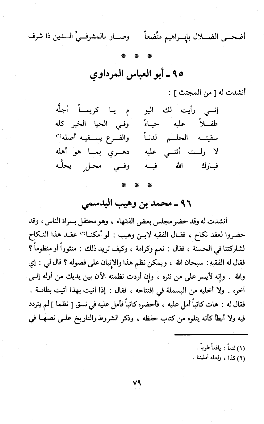 أنشدت لَهُ وَقد حضر مجْلِس بعض الْفُقَهَاء وَهُوَ محتفل بسراة النَّاس وَقد حَضَرُوا لعقد نِكَاح فَقَالَ الْفَقِيه لِابْنِ وهيب لَو أمكنا عقد هَذَا النِّكَاح لشاركتنا فِي الْحَسَنَة فَقَالَ نعم وكرامة وَكَيف تُرِيدُ ذَلِك منثورا أَو منظوما فَقَالَ لَهُ الْفَقِيه سُبْحَانَ الله وَيُمكن نظم هَذَا والاتيان على فصوله قَالَ لي إِي وَالله وَإنَّهُ لايسر على من نثره وَإِن أردْت نظمته الان بَين يَديك من أَوله إِلَى آخِره وَلَا أخليه من الْبَسْمَلَة فِي افتتاحه فَقَالَ إِذا أتيت بِهَذَا أتيت بطامة فَقَالَ لَهُ هَات كَاتبا أمل عَلَيْهِ فَأحْضرهُ كَاتبا فأمل عَلَيْهِ فِي نسق نظما لم يتَرَدَّد فِيهِ وَلَا أَبْطَأَ كَأَنَّهُ يتلوه من كتاب حفظه وَذكر الشُّرُوط والتاريخ على نَصهَا فِي