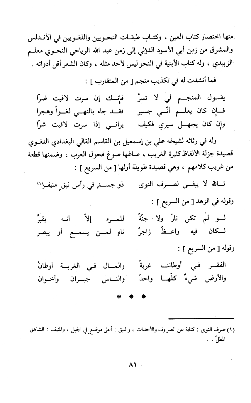 (يَقُول المنجم لي لَا تسر ... فَإنَّك إِن سرت لاقيت ضرا)