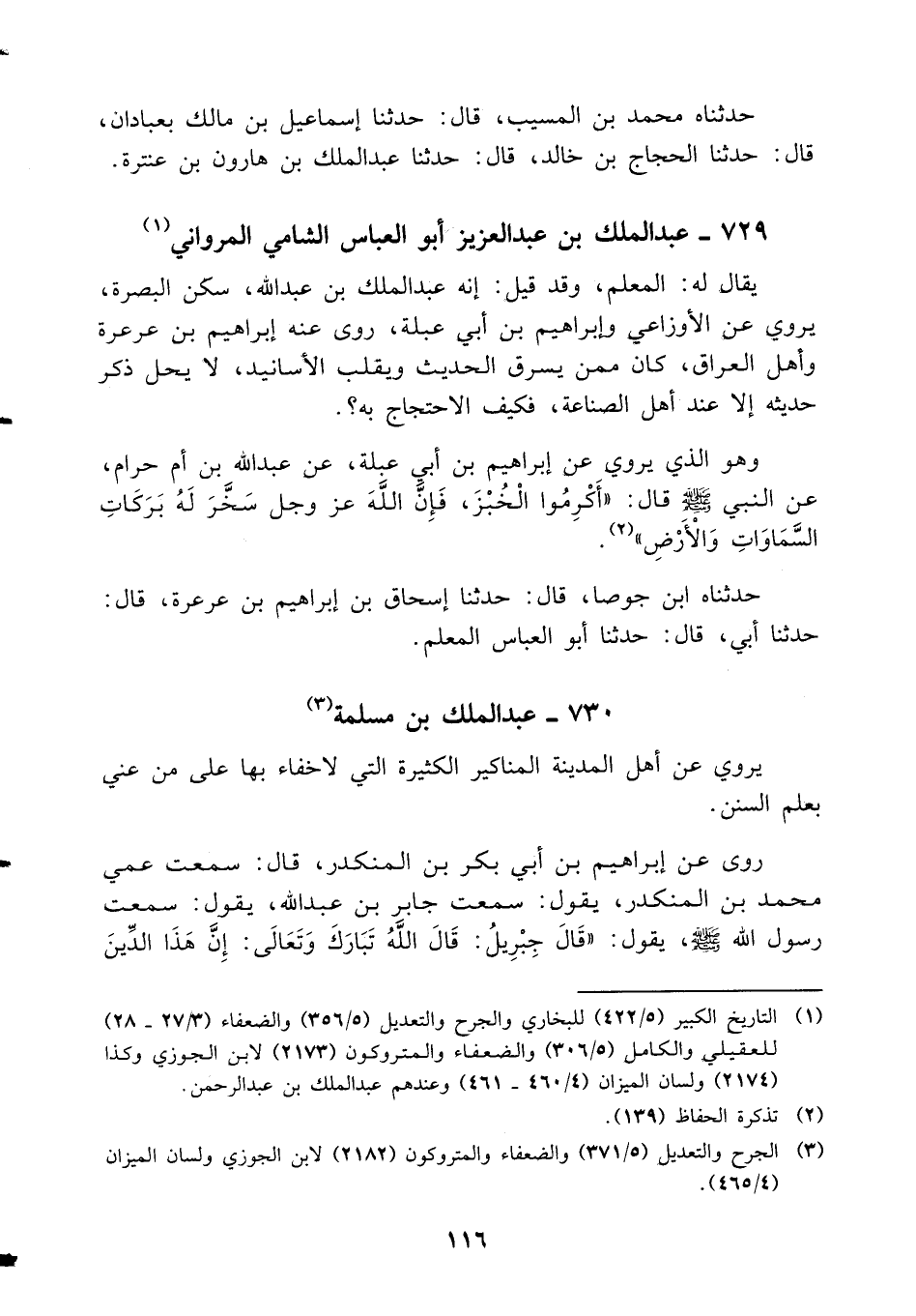 (١) التاريخ الكبير (٥/ ٤٢٢) للبخاري والجرح والتعديل (٥/ ٣٥٦) والضعفاء (٣/ ٢٧ - ٢٨) للعقيلي والكامل (٥/ ٣٠٦) والضعفاء والمتروكون (٢١٧٣) لابن الجوزي وكذا (٢١٧٤) ولسان الميزان (٤/ ٤٦٠ - ٤٦١) وعندهم عبد الملك بن عبد الرحمن.