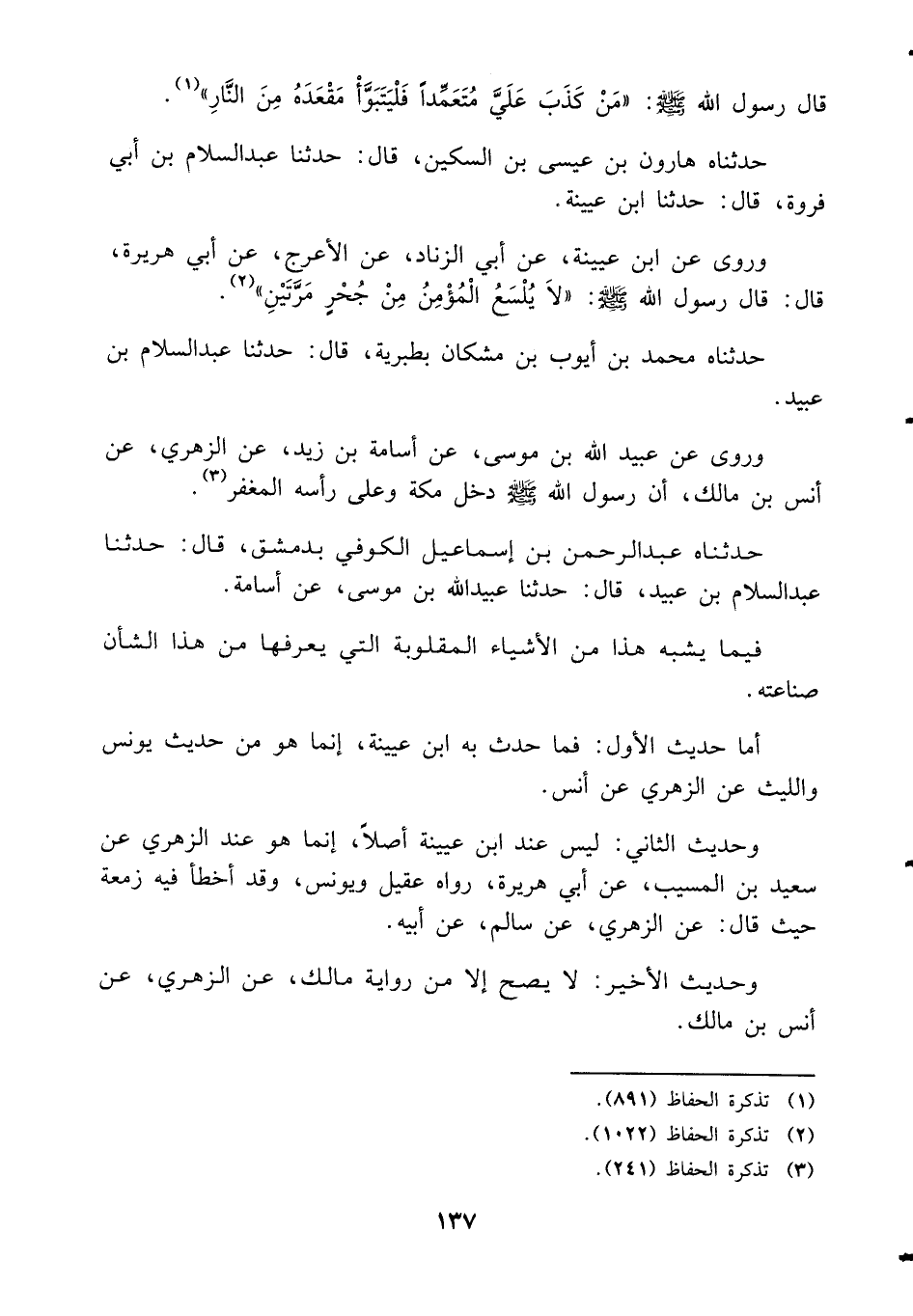 وروى عن ابن عيينة، عن أبي الزناد، عن الأعرج، عن أبي هريرة، قال: قال رسول الله -صلى الله عليه وسلم-: "لَا يُلْسَعُ المُؤْمِنُ مِنْ جُحْرٍ مَرَّتينِ" (٢).