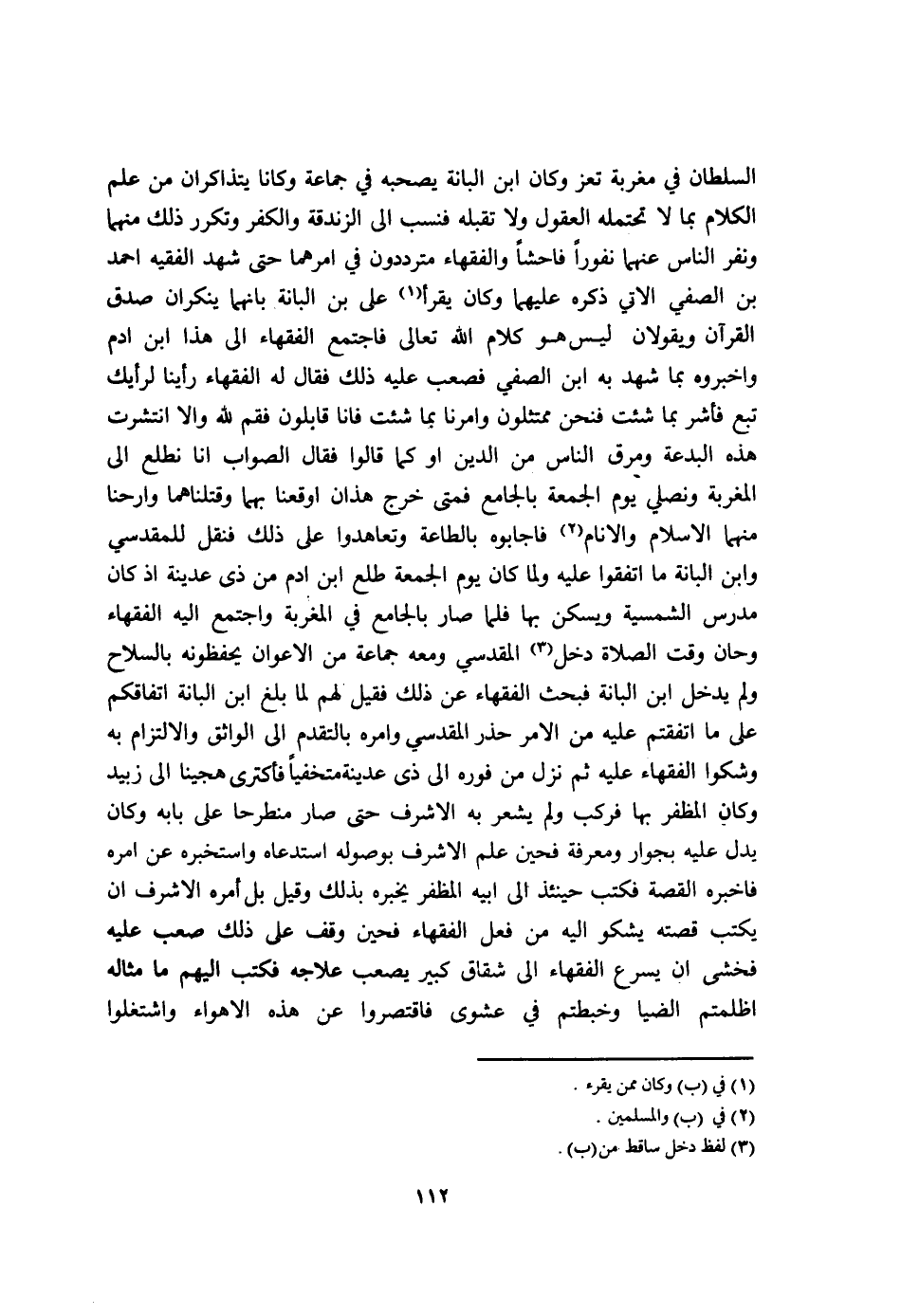 السُّلْطَان فِي مغربة تعز وَكَانَ ابْن البانة يَصْحَبهُ فِي جمَاعَة وَكَانَا يتذاكران من علم الْكَلَام بِمَا لَا تحتمله الْعُقُول وَلَا تقبله فنسب الى الزندقة وَالْكفْر وتكرر ذَلِك مِنْهُمَا وَنَفر النَّاس عَنْهُمَا نفورا فَاحِشا وَالْفُقَهَاء مترددون فِي امرهما حَتَّى شهد الْفَقِيه احْمَد بن الصفي الَّاتِي ذكره عَلَيْهِمَا وَكَانَ يقرا على بن البانة بانهما ينكران صدق الْقُرْآن ويقولان لَيْسَ هُوَ كَلَام الله تَعَالَى فَاجْتمع الْفُقَهَاء الى هَذَا ابْن ادم واخبروه بِمَا شهد بِهِ ابْن الصفي فصعب عَلَيْهِ ذَلِك فَقَالَ لَهُ الْفُقَهَاء رَأينَا لرأيك تبع فأشر بِمَا شِئْت فَنحْن ممتثلون وامرنا بِمَا شِئْت فانا قابلون فَقُمْ لله والا انتشرت هَذِه الْبِدْعَة ومرق النَّاس من الدّين اَوْ كَمَا قَالُوا فَقَالَ الصَّوَاب انا نطلع الى المغربة وَنُصَلِّي يَوْم الْجُمُعَة بالجامع فَمَتَى خرج هَذَانِ اوقعنا بهما وقتلناهما وارحنا مِنْهُمَا الاسلام والانام فاجابوه بِالطَّاعَةِ وتعاهدوا على ذَلِك فَنقل للمقدسي وَابْن البانة مَا اتَّفقُوا عَلَيْهِ وَلما كَانَ يَوْم الْجُمُعَة طلع ابْن ادم من ذِي عدينة اذ كَانَ مدرس الشمسية ويسكن بهَا فَلَمَّا صَار بالجامع فِي المغربة وَاجْتمعَ اليه الْفُقَهَاء وحان وَقت الصَّلَاة دخل الْمَقْدِسِي وَمَعَهُ جمَاعَة من الاعوان يَحْفَظُونَهُ بِالسِّلَاحِ وَلم يدْخل ابْن البانة فبحث الْفُقَهَاء عَن ذَلِك فَقيل لَهُم لما بلغ ابْن البانة اتفاقكم على مَا اتفقتم عَلَيْهِ من الامر حذر الْمَقْدِسِي وامره بالتقدم الى الواثق والالتزام بِهِ وَشَكوا الْفُقَهَاء عَلَيْهِ ثمَّ نزل من فوره الى ذِي عدينة متخفيا فأكثترى هجينا الى زبيد وَكَانَ المظفر بهَا فَركب وَلم يشْعر بِهِ الاشرف حَتَّى صَار منطرحا على بَابه وَكَانَ يدل عَلَيْهِ بجوار وَمَعْرِفَة فحين علم الاشرف بوصوله استدعاه واستخبره عَن أمره فاخبره الْقِصَّة فَكتب حِينَئِذٍ الى ابيه المظفر يُخبرهُ بذلك وَقيل بل أمره الاشرف أَن يكْتب قصَّته يشكو اليه من فعل الْفُقَهَاء فحين وقف على ذَلِك صَعب عَلَيْهِ فخشى ان يسْرع الْفُقَهَاء الى شقَاق كَبِير يصعب علاجه فَكتب اليهم مَا مِثَاله اظلمتم الضيا وخبطتم فِي عشوى فاقتصروا عَن هَذِه الْأَهْوَاء وَاشْتَغلُوا