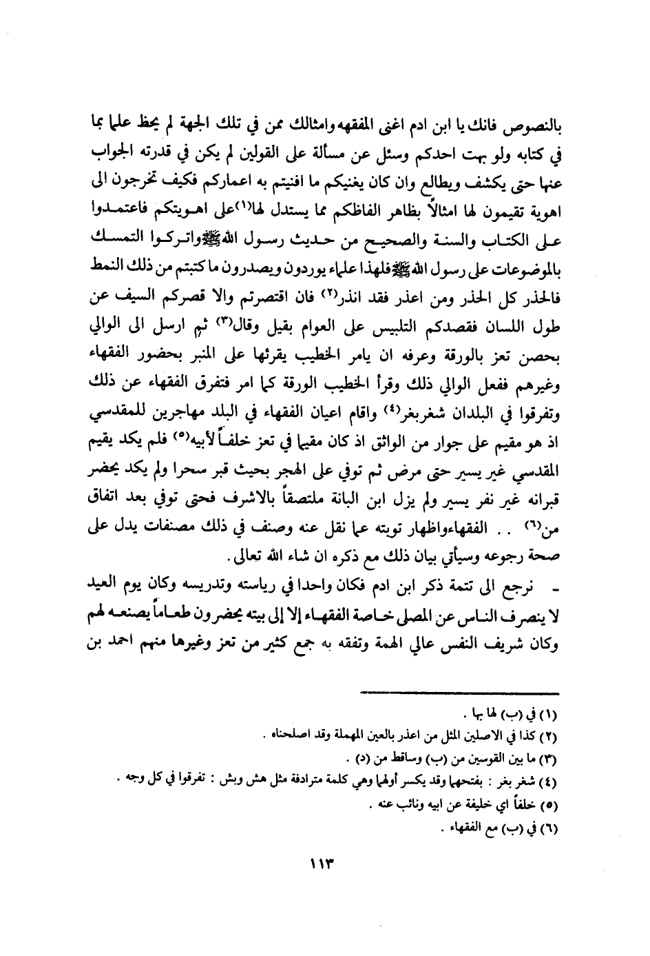 نرْجِع الى تَتِمَّة ذكر ابْن ادم فَكَانَ وَاحِدًا فِي رياسته وتدريسه وَكَانَ يَوْم الْعِيد لَا ينْصَرف النَّاس عَن الْمصلى خَاصَّة الْفُقَهَاء الا إِلَى بَيته يحْضرُون طَعَاما يصنعه لَهُم وَكَانَ شرِيف النَّفس عالي الهمة وتفقه بِهِ جمع كثير من تعز وَغَيرهَا مِنْهُم احْمَد بن