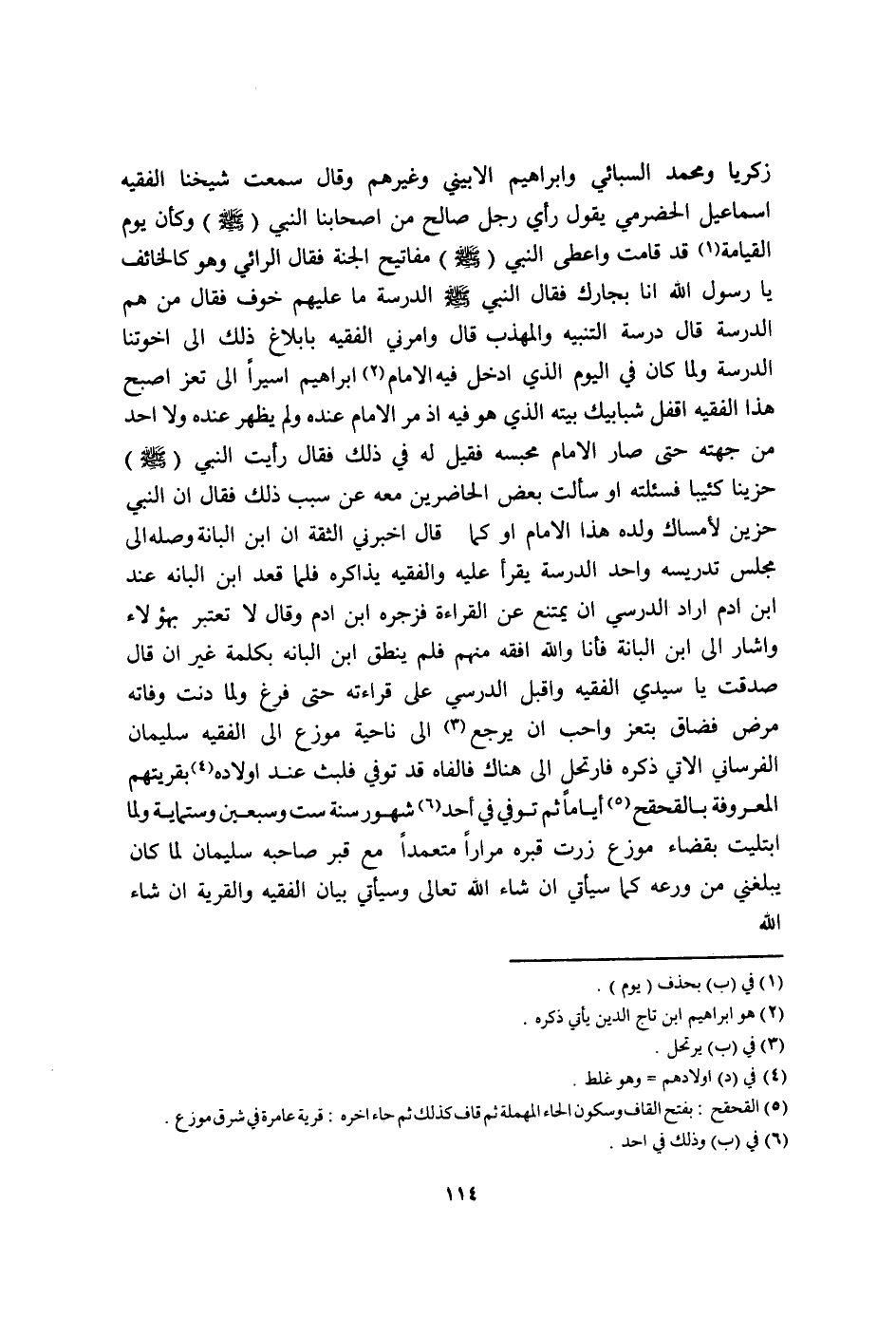 زَكَرِيَّا وَمُحَمّد السبائي وابراهيم الابيني وَغَيرهم وَقَالَ سَمِعت شَيخنَا الْفَقِيه اسماعيل الْحَضْرَمِيّ يَقُول رَأْي رجل صَالح من اصحابنا النَّبِي صلى الله عَلَيْهِ وَسلم وَكَأن يَوْم الْقِيَامَة قد قَامَت واعطى النَّبِي صلى الله عَلَيْهِ وَسلم مَفَاتِيح الْجنَّة فَقَالَ الرَّائِي وَهُوَ كالخائف يَا رَسُول الله انا بجارك فَقَالَ النَّبِي صلى الله عَلَيْهِ وَسلم الدرسة مَا عَلَيْهِم خوف فَقَالَ من هم الدرسة قَالَ درسة التَّنْبِيه والمهذب قَالَ وامرني الْفَقِيه بابلاغ ذَلِك الى اخوتنا الدرسة وَلما كَانَ فِي الْيَوْم الَّذِي ادخل فِيهِ الامام ابراهيم اسيرا الى تعز اصبح هَذَا الْفَقِيه اقفل شبابيك بَيته الَّذِي هُوَ فِيهِ اذ مر الامام عِنْده وَلم يظْهر عِنْده وَلَا اُحْدُ من جِهَته حَتَّى صَار الامام محبسه فَقيل لَهُ فِي ذَلِك فَقَالَ رَأَيْت النَّبِي صلى الله عَلَيْهِ وَسلم حَزينًا كئيبا فسئلته اَوْ سَأَلت بعض الْحَاضِرين مَعَه عَن سَبَب ذَلِك فَقَالَ ان النَّبِي حَزِين لأمساك وَلَده هَذَا الامام اَوْ كَمَا قَالَ اخبرني الثِّقَة ان ابْن البانة وَصله الى مجْلِس تدريسه وَاحِد الدرسة يقْرَأ عَلَيْهِ والفقيه يذاكره فَلَمَّا قعد ابْن البانة عِنْد ابْن ادم اراد الدرسي ان يمْتَنع عَن الْقِرَاءَة فزجره ابْن ادم وَقَالَ لَا تعْتَبر بهؤلاء واشار الى ابْن البانة فَأَنا وَالله افقه مِنْهُم فَلم ينْطق ابْن البانة بِكَلِمَة غير ان قَالَ صدقت يَا سَيِّدي الْفَقِيه وَاقْبَلْ الدرسي على قِرَاءَته حَتَّى فرغ وَلما دنت وَفَاته مرض فَضَاقَ بتعز واحب ان يرجع الى نَاحيَة موزع الى الْفَقِيه سُلَيْمَان الفرساني الَّاتِي ذكره فارتحل الى هُنَاكَ فالفاه قد توفّي فَلبث عِنْد اولاده بقريتهم الْمَعْرُوفَة بالقحقح أَيَّامًا ثمَّ توفّي فِي اُحْدُ شهور سنة سِتّ وسعبين وستماية وَلما ابْتليت بِقَضَاء موزع زرت قَبره مرَارًا مُتَعَمدا مَعَ قبر صَاحبه سُلَيْمَان لما كَانَ يبلغنِي من ورعه كَمَا سَيَأْتِي إِن شَاءَ الله تَعَالَى وَسَيَأْتِي بَيَان الْفَقِيه والقرية ان شَاءَ الله
