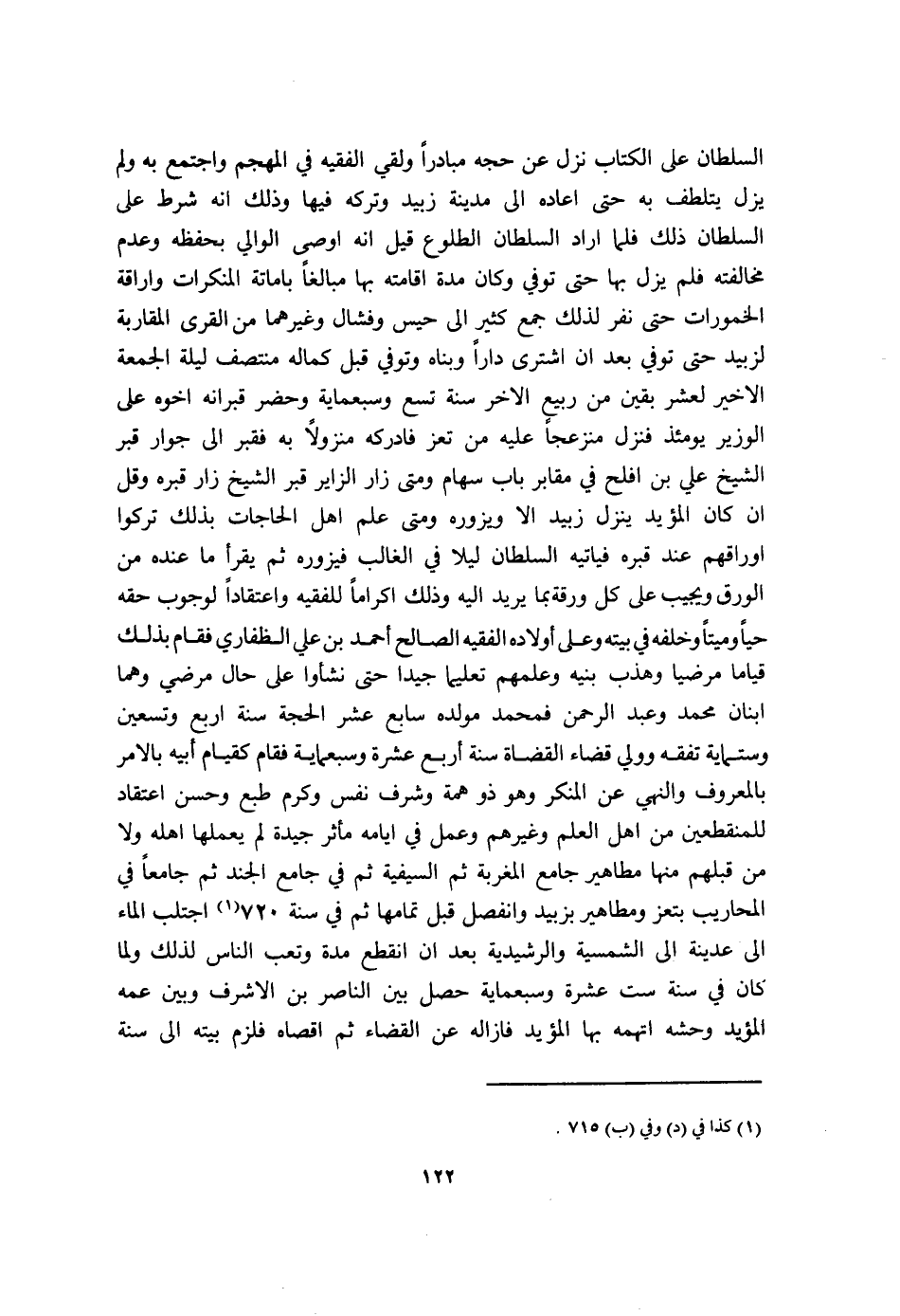 السُّلْطَان على الْكتاب نزل عَن حجه مبادرا وَلَقي الْفَقِيه فِي المهجم وَاجْتمعَ بِهِ وَلم يزل يتلطف بِهِ حَتَّى اعاده الى مَدِينَة زبيد وَتَركه فِيهَا وَذَلِكَ انه شَرط على السُّلْطَان ذَلِك فَلَمَّا اراد السُّلْطَان الطُّلُوع قيل انه اوصى الْوَالِي بحفظه وَعدم مُخَالفَته فَلم يزل بهَا حَتَّى توفّي وَكَانَ مُدَّة اقامته بهَا مبالغا باماته الْمُنْكَرَات واراقة الخمورات حَتَّى نفر لذَلِك جمع كثير الى حيس وفشال وَغَيرهمَا من الْقرى المقاربة لزبيد حَتَّى توفّي بعد ان اشْترى دَارا وبناه وَتُوفِّي قبل كَمَاله منتصف لَيْلَة الْجُمُعَة الاخير لعشر بَقينَ من ربيع الاخر سنة تسع وسبعماية وَحضر قبرانه اخوه على الْوَزير يَوْمئِذٍ فَنزل منزعجا عَلَيْهِ من تعز فادركه منزولا بِهِ فقبر الى جوَار قبر الشَّيْخ عَليّ بن افلح فِي مَقَابِر بَاب سِهَام وَمَتى زار الزاير قبر الشَّيْخ زار قَبره وَقل ان كَانَ الْمُؤَيد ينزل زبيد الا ويزوره وَمَتى علم اهل الْحَاجَات بذلك تركُوا اوراقهم عِنْد قَبره فياتيه السُّلْطَان لَيْلًا فِي الْغَالِب فيزوره ثمَّ يقرا مَا عِنْده من الْوَرق ويجيب على كل ورقة بِمَا يُرِيد اليه وَذَلِكَ اكراما للفقيه واعتقادا لوُجُوب حَقه حَيا وَمَيتًا وَخَلفه فِي بَيته وعَلى أَوْلَاده الْفَقِيه الصَّالح أَحْمد بن عَليّ الظفاري فَقَامَ بذلك قيَاما مرضيا وهذب بنيه وعلمهم تَعْلِيما جيدا حَتَّى نشأوا على حَال مرضِي وهما ابْنَانِ مُحَمَّد وَعبد الرَّحْمَن فمحمد مولده سَابِع عشر الْحجَّة سنة ارْبَعْ وتستعين وستماية تفقه وَولي قَضَاء الْقُضَاة سنة أَربع عشرَة وسبعماية فَقَامَ كقيام أَبِيه بالمر بِالْمَعْرُوفِ وَالنَّهْي عَن الْمُنكر وَهُوَ ذُو همة وَشرف نفس وكرم طبع وَحسن اعْتِقَاد للمنقطعين من اهل الْعلم وَغَيرهم وَعمل فِي أَيَّامه مأثر جَيِّدَة لم يعلمهَا اهله وَلَا من قبلهم مِنْهَا مطاهير جَامع المغربة ثمَّ السيفية ثمَّ فِي جَامع الْجند ثمَّ جَامعا فِي المحاريب بتعز وَمظَاهر بزبيد وانفصل قبل تَمامهَا ثمَّ فِي سنة 720 اجتلب المَاء الى عدينة الى الشمسية والرشيدية بعد ان انْقَطع مُدَّة وتعب النَّاس لذَلِك وَلما كَانَ فِي سنة سِتّ عشرَة وسبعماية حصل بَين النَّاصِر بن الاشرف وَبَين عَمه الْمُؤَيد وحشه اتهمه بهَا الْمُؤَيد فازاله عَن الْقَضَاء ثمَّ اقصاه فَلَزِمَ بَيته الى سنة