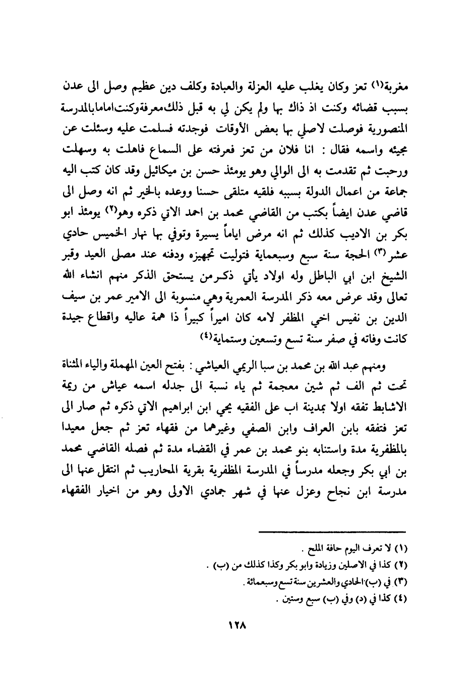 مغربة تعز وَكَانَ يغلب عَلَيْهِ الْعُزْلَة وَالْعِبَادَة وكلف دين عَظِيم وصل الى عدن بِسَبَب قَضَائِهِ وَكنت اذ ذَاك بهَا وَلم يكن لي بِهِ قبل ذَلِك معرفَة وَكنت اماما بِالْمَدْرَسَةِ المنصورية فوصلت لاصلي بهَا بعض الْأَوْقَات فَوَجَدته فَسلمت عَلَيْهِ وسئلت عَن مجيئة واسْمه فَقَالَ انا فلَان من تعز فعرفته على السماع فاهلت بِهِ وسهلت ورحبت ثمَّ تقدّمت بِهِ الى الْوَالِي وَهُوَ يَوْمئِذٍ حسن بن مِيكَائِيل وَقد كَانَ كتب اليه جمَاعَة من اعمال الدولة بِسَبَبِهِ فَلَقِيَهُ متلقى حسنا ووعده بِالْخَيرِ ثمَّ انه وصل الى قَاضِي عدن ايضا بكتب من القَاضِي مُحَمَّد بن احْمَد الَّاتِي ذكره وَهُوَ يَوْمئِذٍ ابو بكر بن الاديب كَذَلِك ثمَّ انه مرض اياما يسيرَة وَتُوفِّي بهَا نَهَار الْخَمِيس حادي عشر الْحجَّة سنة سبع وسبعماية فتوليت تَجْهِيزه وَدَفنه عِنْد مصلى الْعِيد وقبر الشَّيْخ ابْن ابي الْبَاطِل وَله اولاد يَأْتِي ذكر من يسْتَحق الذّكر مِنْهُم انشاء الله تَعَالَى وَقد عرض مَعَه ذكر الْمدرسَة العمرية وَهِي منسوبة الى الامير عمر بن سيف الدّين بن نَفِيس اخي المظفر لامه كَانَ اميرا كَبِيرا ذَا همة عاليه واقطاع جَيِّدَة كَانَت وَفَاته فِي صفر سنة تسع وَتِسْعين وستماية
