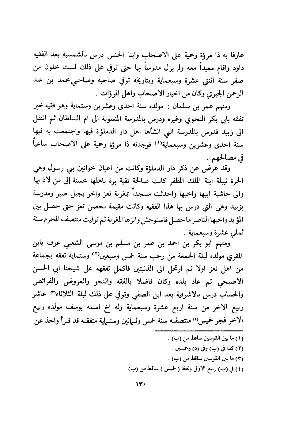 وَمِنْهُم عمر بن سلمَان مولده سنة احدى وَعشْرين وستماية وَهُوَ فَقِيه خير تفقه بَابي بكر النَّحْوِيّ وَغَيره ودرس بِالْمَدْرَسَةِ المنسوبة الى ام السُّلْطَان ثمَّ انْتقل الى زبيد فدرس بِالْمَدْرَسَةِ الَّتِي انشأها اهل دَار الدملؤة فِيهَا وَاجْتمعت بِهِ فِيهَا سنة احدى وَعشْرين وسبعماية فَوَجَدته ذَا مرؤة وحمية على الاصحاب ساعيا فِي مصالحهم