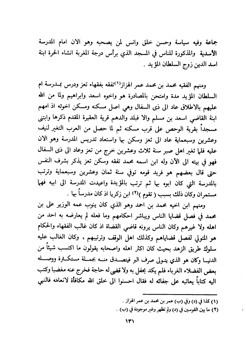 وَمِنْهُم الْفَقِيه مُحَمَّد بن مُحَمَّد عمر الهزاز تفقه بفقهاء تعز ودرس بمدرسة ام السُّلْطَان الْمُؤَيد مُدَّة وامتحن بالمصادرة هُوَ واخوه اِسْعَدْ وَإِبْرَاهِيم وَلما من الله عَلَيْهِم بالاطلاق عَاد الى ذِي السفال وَهِي اصل مَسْكَنه ومسكن اخوته اذ امهم ابْنة القَاضِي اِسْعَدْ بن مُسلم والا فبلد والدهم قَرْيَة العقيرة الْمُقدم ذكرهَا وابتنى مَسْجِدا بقرية الوحص على قرب مَسْكَنه ثمَّ لما حصل من الْعَرَب التَّغَيُّر لنيف وَعشْرين وسبعماية عَاد الى تعز وَسكن بهَا واستعاد تدريس الْمدرسَة وَهُوَ الان عَلَيْهِ فَلَمَّا تغير اهل صَبر سنة ثَلَاث وَعشْرين خرج من تعز وَعَاد الى ذِي السفال فَهُوَ فِي بَيته الى الْآن وَله ابْن اسْمه مُحَمَّد تفقه وَسكن تعز يذكر بشرف النَّفس حَتَّى قَالَ بَعضهم هُوَ فريد قومه توفّي سنة ثَمَان وَعشْرين وسبعماية وترتب بِالْمَدْرَسَةِ الَّتِي كَانَ ابوه بهَا ثمَّ ترَتّب بالمؤيدة واعيدت الْمدرسَة الى ابيه فهما مستمران وَكَانَ ذَلِك بِسَبَب تقوم ابْن زَكَرِيَّا اذ كَانَ مدرسا بهَا