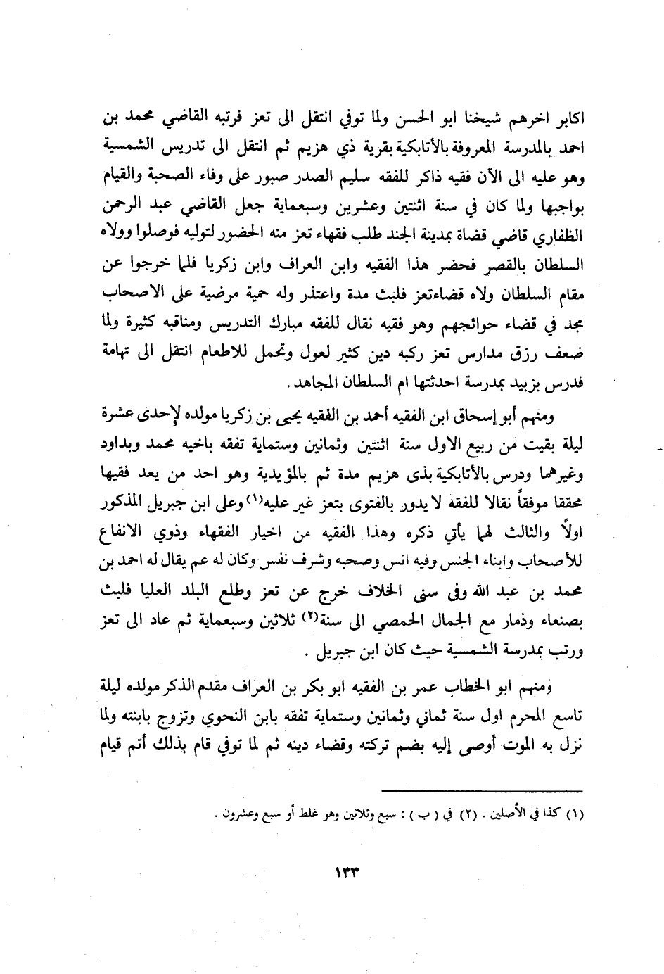 اكابر اخرهم شَيخنَا ابو الْحسن وَلما توفّي انْتقل الى تعز فرتبه القَاضِي مُحَمَّد بن احْمَد بِالْمَدْرَسَةِ الْمَعْرُوفَة بالأتابكية بقرية ذِي هزيم ثمَّ انْتقل الى تدريس الشمسية وَهُوَ عَلَيْهِ الى االآن فَقِيه ذَاكر للفقه سليم الصَّدْر صبور على وَفَاء الصُّحْبَة وَالْقِيَام بواجبها وَلما كَانَ فِي سنة اثْنَتَيْنِ وَعشْرين وسبعماية جعل القَاضِي عبد الرَّحْمَن الظفاري قَاضِي قُضَاة بِمَدِينَة الْجند طلب فُقَهَاء تعز مِنْهُ الْحُضُور لتوليه فوصلوا وولاه السُّلْطَان بِالْقصرِ فَحَضَرَ هَذَا الْفَقِيه وَابْن العراف وَابْن زَكَرِيَّا فَلَمَّا خَرجُوا عَن مقَام السُّلْطَان ولاه قَضَاء تعز فَلبث مُدَّة وَاعْتذر وَله حمية مرضية على الاصحاب مجد فِي قَضَاء حوائجهم وَهُوَ فَقِيه نقال للفقه مبارك التدريس ومناقبه كَثِيرَة وَلما ضعف رزق مدارس تعز رَكبه دين كثير لعول وَتحمل للاطعام انْتقل الى تهَامَة فدرس بزبيد بمدرسة احدثتها ام السُّلْطَان الْمُجَاهِد