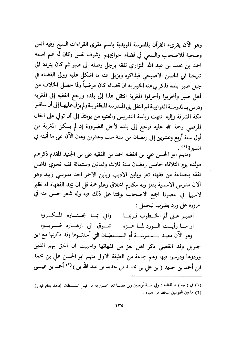 اَوْ مَا رَأَيْت الْورْد لما هزه ... شوق الى ازهاره ضربوه ... وَهُوَ الْآن معيد بمدرسة أم السُّلْطَان الَّتِي أحدثوها وَقد ذكرتها مَعَ ابْن جِبْرِيل وَقد انْقَضى ذكر اهلتعز من فقهائها واحببت ان الْحق بهم الَّذين وردوها ودرسوا فِيهَا وهم جمَاعَة من الطَّبَقَة الاولى مِنْهُم ابو الْحسن عَليّ بن مُحَمَّد ابْن أَحْمد بن حَدِيد بن عَليّ بن مُحَمَّد بن حَدِيد بن عبد الله بن أَحْمد بن عِيسَى