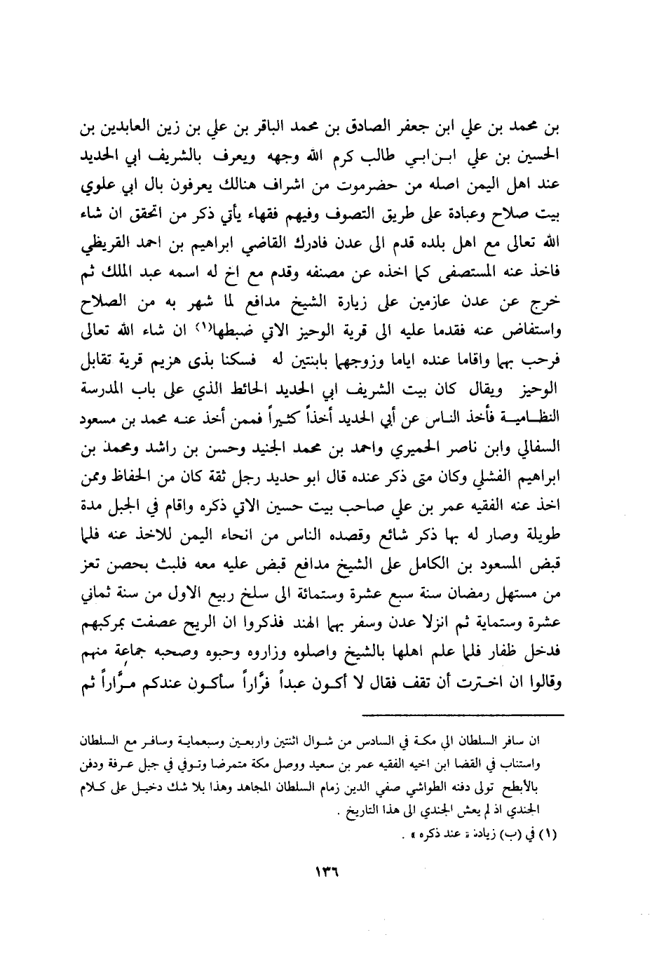 بن مُحَمَّد بن عَليّ ابْن جَعْفَر الصَّادِق بن مُحَمَّد الباقر بن عَليّ بن زين العابدين بن الْحُسَيْن بن عَليّ ابْن ابي طَالب كرم الله وَجهه وَيعرف بالشريف ابي الْحَدِيد عِنْد أهل الْيمن اصله من حَضرمَوْت من اشراف هُنَالك يعْرفُونَ بَال ابي علوي بَيت صَلَاح وَعبادَة على طَرِيق التصوف وَفِيهِمْ فُقَهَاء يَأْتِي ذكر من اتحقق ان شَاءَ الله تَعَالَى مَعَ أهل بَلَده قدم الى عدن فادرك القَاضِي ابراهيم ابْن احْمَد القريظي فاخذ عَنهُ الْمُسْتَصْفى كَمَا اخذه عَن مُصَنفه وَقدم مَعَ اخ لَهُ اسْمه عبد الْملك ثمَّ خرج عَن عدن عازمين على زِيَارَة الشَّيْخ مدافع لما شهر بِهِ من الصّلاح واستفاض عَنهُ فَقدما عَلَيْهِ الى قَرْيَة الوحيز الَّاتِي ضَبطهَا ان شَاءَ الله تَعَالَى فَرَحَّبَ بهما واقاما عِنْده اياما وزوجهما بابنتين لَهُ فسكنا بِذِي هزيم قَرْيَة تقَابل الوحيز وَيُقَال كَانَ بَيت الشريف ابي الْحَدِيد الْحَائِط الَّذِي على بَاب الْمدرسَة النظامية فَأخذ النَّاس عَن أبي الْحَدِيد أخذا كثيرا فَمِمَّنْ أَخذ عَنهُ مُحَمَّد بن مَسْعُود السفالي وَابْن نَاصِر الْحِمْيَرِي وَاحْمَدْ بن مُحَمَّد الْجُنَيْد وَحسن بن رَاشد وَمُحَمّد بن ابراهيم الفشلي وَكَانَ مَتى ذكر عِنْده قَالَ ابو حَدِيد رجل ثِقَة كَانَ من الْحفاظ وَمِمَّنْ اخذ عَنهُ الْفَقِيه عمر بن عَليّ صَاحب بَيت حُسَيْن الَّاتِي ذكره واقام فِي الْجَبَل مُدَّة طَوِيلَة وَصَارَ لَهُ بهَا ذكر شَائِع وقصده النَّاس من انحاء الْيمن للاخذ عَنهُ فَلَمَّا قبض المسعود بن الْكَامِل على الشَّيْخ مدافع قبض عَلَيْهِ مَعَه فَلبث بحصن تعز من مستهل رَمَضَان سنة سبع عشرَة وسِتمِائَة الى سلخ ربيع الاول من سنة ثَمَانِي عشرَة وستماية ثمَّ انزلا عدن وسفر بهما الْهِنْد فَذكرُوا ان الرّيح عصفت بمركبهم فَدخل ظفار فَلَمَّا علم اهلها بالشيخ واصلوه وزاروه وحبوه وَصَحبه جمَاعَة مِنْهُم وَقَالُوا ان اخْتَرْت أَن تقف فَقَالَ لَا أكون عبدا فِرَارًا سأكون عنْدكُمْ مرَارًا ثمَّ