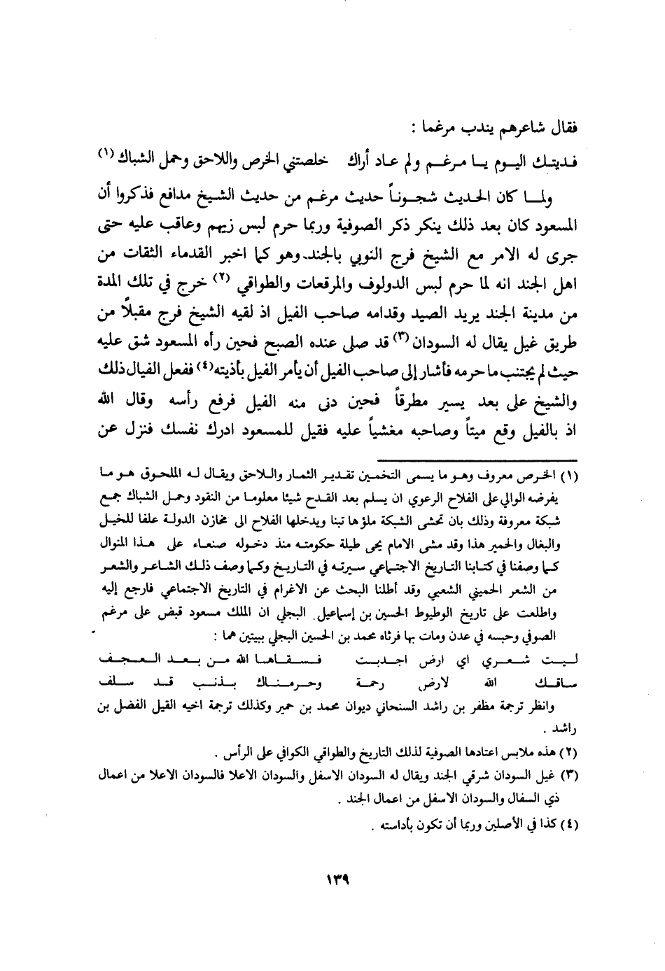 فَقَالَ شاهرهم ينْدب مرغما ... فديتك الْيَوْم يَا مرغم وَلم عَاد أَرَاك ... خلصتني الْخرص واللاحق وَحمل الشباك ... وَلما كَانَ الحَدِيث شجونا حَدِيث مرغم من حَدِيث الشَّيْخ مدافع فَذكرُوا أَن المسعود كَانَ بعد ذَلِك يُنكر ذكر الصُّوفِيَّة وَرُبمَا حرم لبس زيهم وعاقب عَلَيْهِ حَتَّى جرى لَهُ الامر مَعَ الشَّيْخ فرج النوبي بالجند وَهُوَ كَمَا اخبر القدماء الثِّقَات من اهل الْجند انه لما حرم لبس الدولوف والمرقعات والطواقي خرج فِي تِلْكَ الْمدَّة من مَدِينَة الْجند يُرِيد الصَّيْد وقدامه صَاحب الْفِيل اذ لقِيه الشَّيْخ فرج مُقبلا من طَرِيق غيل يُقَال لَهُ السودَان قد صلى عِنْده الصُّبْح فحين رأه المسعود شقّ عَلَيْهِ حَيْثُ لم يجْتَنب مَا حرمه فَأَشَارَ إِلَى صَاحب الْفِيل أَن يَأْمر الْفِيل بأذيته فَفعل الفيال ذَلِك وَالشَّيْخ على بعد يسير مطرقا فحين دنى مِنْهُ الْفِيل فَرفع رَأسه وَقَالَ الله اذ بالفيل وَقع مَيتا وَصَاحبه مغشيا عَلَيْهِ فَقيل للمسعود اِدَّرَكَ نَفسك فَنزل عَن