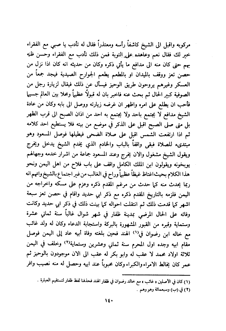 مركوبه وَاقْبَلْ الى الشَّيْخ كاشفا رَأسه ومعتذرا فَقَالَ لَهُ تأدب يَا صبي مَعَ الْفُقَرَاء خير لَك فَقَالَ نعم وعاهده على التَّوْبَة فَمن ذَلِك تأدب مَعَ الْفُقَرَاء وَحسن ظَنّه بهم حَتَّى كَانَ مِنْهُ الى مدافع مَا يَأْتِي ذكره وَكَانَ من حَدِيثه انه كَانَ اذا نزل من حصن تعز ووقف بالميدان اَوْ بالمطعم يطعم الْجَوَارِح الصيدية فيجد جمعا من الْعَسْكَر وَغَيرهم يروحون طَرِيق الوحيز فيسال عَن ذَلِك فَيُقَال لزيارة رجل من الصُّوفِيَّة كَبِير الْحَال ثمَّ بحث عَنهُ فاخبر بَان لَهُ قبولا عَظِيما ومحلا بَين الْعَالم جسيما فَأحب ان يطلع على امْرَهْ واظهر ان غَرَضه زيارته وَوصل الى بَابه وَكَانَ من عَادَة الشَّيْخ مدافع لَا يجْتَمع باحد وَلَا يجْتَمع بِهِ اُحْدُ من اذان الصُّبْح الى قرب الظّهْر بل مَتى صلى الصُّبْح اقبل على الذّكر فِي مَوضِع من بَيته فَلَا يَسْتَطِيع أحد كَلَامه ثمَّ اذا ارْتَفَعت الشَّمْس اقبل على صَلَاة الضُّحَى فيطيلها فوصل المسعود وَهُوَ مبتدئ للصَّلَاة فبقى وَاقِفًا بِالْبَابِ وَالْخَادِم الَّذِي يخْدم الشَّيْخ يدْخل وَيخرج وَيَقُول الشَّيْخ مَشْغُول والان يخرج وَعند المسعود جمَاعَة من اشرار خدمه وجهالهم يوبخونه وَيَقُولُونَ ابْن الْملك الْكَامِل وَاقِف على بَاب فلاح من اهل الْيمن وَنَحْو هَذَا الْكَلَام بِحَيْثُ اغتاظ غيظا عَظِيما وَرَاح فِي الْغَالِب من غير اجْتِمَاع بالشيخ واتهم انه رُبمَا يحدث مِنْهُ كَمَا حدث من مرغم الْمُقدم ذكره وعزم على مسكه واخراجه من الْيمن فَلَزِمَهُ بالتاريخ الْمُقدم ذكره مَعَ ذكر ابي حَدِيد واقام فِي حصن تعز سَبْعَة اشهر كَمَا قدمت ذَلِك ثمَّ انْتَقَلت احواله كَمَا بيّنت ذَلِك فِي ذكر ابي حَدِيد وَكَانَت وَفَاته على الْحَال المرضي بِمَدِينَة ظفار فِي شهر شَوَّال غَالِبا سنة ثَمَانِي عشرَة وستماية وقبره من الْقُبُور الْمَشْهُورَة بِالْبركَةِ واستجابه الدُّعَاء وَكَانَ لَهُ ولد غَائِب مَعَ خَاله ابْن رضوَان فِي الْهِنْد فحين بلغته وَفَاة أَبِيه عَاد إِلَى الْيمن فوصل مقَام ابيه وجده اول الْمحرم سنة ثَمَانِي وَعشْرين وستماية وَخلف فِي الْيمن ثَلَاثَة أَوْلَاد مُحَمَّد لَا عقب لَهُ وَأَبُو بكر لَهُ عقب الى الان موجودون بالوحيز ثمَّ عمر كَانَ يخالط الامراء والكبراء وَكَانَ محبوبا عِنْد ابيه وَحصل لَهُ مِنْهُ نصيب وافر