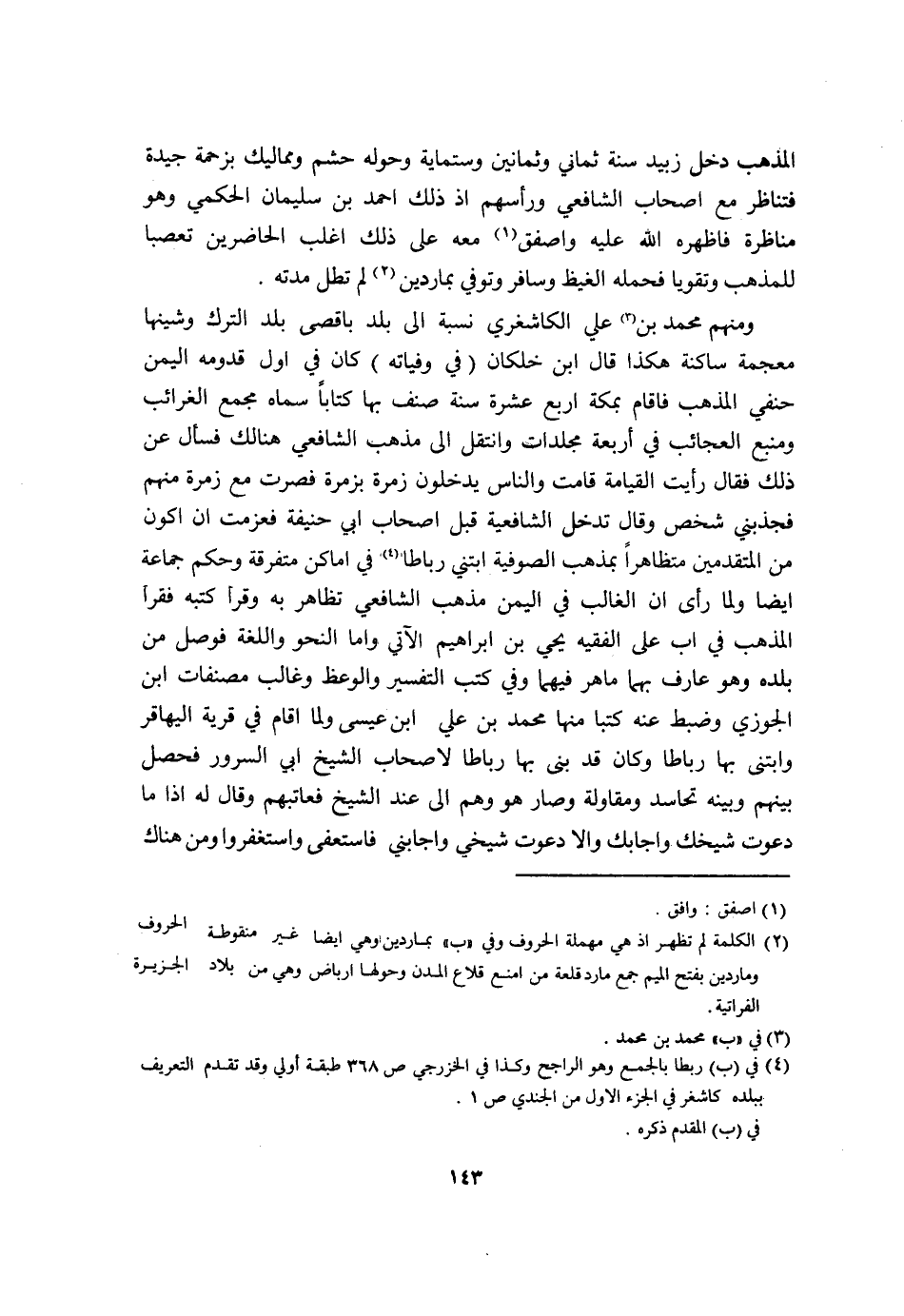 وَمِنْهُم مُحَمَّد بن عَليّ الكاشغري نِسْبَة الى بلد باقصى بلد التّرْك وشينها مُعْجمَة ساكنه هَكَذَا قَالَ ابْن خلكان فِي وفياته كَانَ فِي اول قدومه الْيمن حَنَفِيّ الْمَذْهَب فاقام بِمَكَّة ارْبَعْ عشرَة سنة صنف بهَا كتابا سَمَّاهُ مجمع الغرائب ومنبع الْعَجَائِب فِي أَرْبَعَة مجلدات وانتقل الى مَذْهَب الشَّافِعِي هُنَالك فَسَأَلَ عَن ذَلِك فَقَالَ رَأَيْت الْقِيَامَة قَامَت وَالنَّاس يدْخلُونَ زمرة بزمرة فصرت مَعَ زمرة مِنْهُم فجذبني شخص وَقَالَ تدخل الشَّافِعِيَّة قبل اصحاب ابي حنيفَة فعزمت ان اكون من الْمُتَقَدِّمين متظاهرا بِمذهب الصُّوفِيَّة ابتني رِبَاطًا فِي أَمَاكِن مُتَفَرِّقَة وَحكم جمَاعَة ايضا وَلما رأى ان الْغَالِب فِي الْيمن مَذْهَب الشَّافِعِي تظاهر بِهِ وَقَرَأَ كتبه فَقَرَأَ الْمَذْهَب فِي اب على الْفَقِيه يحي بن ابراهيم الَّاتِي واما النَّحْو اللُّغَة فوصل من بَلَده وَهُوَ عَارِف بهما ماهر فيهمَا وَفِي كتب التَّفْسِير والوعظ وغالب مصنفات ابْن الْجَوْزِيّ وَضبط عَنهُ كتبا مِنْهَا مُحَمَّد بن عَليّ ابْن عِيسَى وَلما اقام فِي قَرْيَة اليهاقر وابتنى بهَا رِبَاطًا وَكَانَ قد بنى بهَا رِبَاطًا لاصحاب الشَّيْخ ابي السرُور فَحصل بَينهم وَبَينه تحاسد ومقاولة وَصَارَ هُوَ وهم الى عِنْد الشَّيْخ فعاتبهم وَقَالَ لَهُ اذا مَا دَعَوْت شيخك واجابك والا دَعَوْت شَيْخي واجباني فاستعفى وَاسْتَغْفرُوا وَمن هُنَاكَ