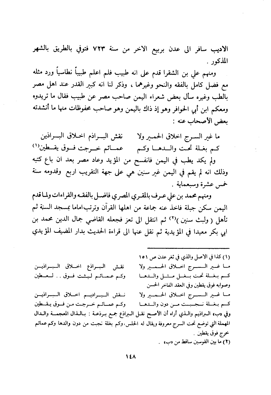 وَمِنْهُم عَليّ بن الشقرا قدم على انه طَبِيب فَلم اعْلَم طَبِيبا نطاسيا ورد مثله مَعَ فضل كَامِل بالفقه والنحو وَغَيرهمَا وَذكر لنا انه كَبِير الْقدر عِنْد اهل مصر بالطب وَغَيره سَالَ بعض شعراء الْيمن صَاحب مصر عَن طَبِيب فَقَالَ مَا تريدوه وَمَعَكُمْ ابْن أبي الحوافر وَهُوَ إِذْ ذَاك بِالْيمن وَهُوَ صَاحب محفوظات مِنْهَا مَا أنشدته بعض الْأَصْحَاب عَنهُ ... مَا غير السرج اخلاق الْحمير وَلَا ... نقش البراذم اخلاق البراذين