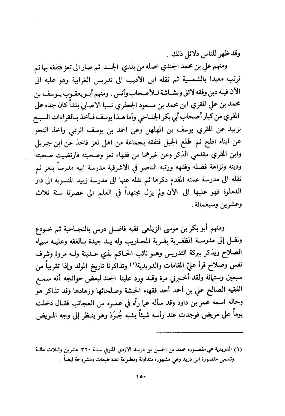 وَمِنْهُم عَليّ بن مُحَمَّد الجندي اصله من بلدي الْجند ثمَّ صَار الى تعز فتفقه بهَا ثمَّ ترَتّب معيدا بالشمسية ثمَّ نَقله ابْن الاديب الى تدريس الغرابية وَهُوَ عَلَيْهِ الى الْآن فِيهِ دين وَفقه لَائِق وبشاشة للأصحاب وَأنس وَمِنْهُم أَبُو يَعْقُوب يُوسُف بن مُحَمَّد بن عَليّ الْمقري ابْن مُحَمَّد بن مَسْعُود الْجَعْفَرِي نسبا الاصابي بَلَدا كَانَ جده على الْمقري من كبار أَصْحَاب أبي بكر الجناحي وَأما هَذَا يُوسُف فَأخذ بالقراءات السَّبع بزبيد عَن الْمقري يُوسُف بن المهلهل وَعَن احْمَد بن يُوسُف الريمي واخذ النَّحْو عَن ابناء افلح ثمَّ طلع الْجَبَل فتفقه بِجَمَاعَة من اهل تعز فاخذ عَن ابْن جِبْرِيل وَابْن الْمقري مقدمي الذّكر وَعَن غَيرهمَا من فُقَهَاء تعز وصحبته فارتضيت صحبته وَدينه ونزاهة فَضله وفقهه ورتبه النَّاصِر فِي الاشرفية مدرسة ابيه مدرسا بتعز ثمَّ نَقله الى مدرسة عمته الْمُقدم ذكرهَا ثمَّ نَقله عَنْهَا الى مدرسة زبيد المنسوبة الى دَار الدملوة فَهُوَ عَلَيْهَا الى الْآن وَلم يزل مُجْتَهدا فِي الْعلم الى عصرنا سنة ثَلَاث وَعشْرين وَسَبْعمائة