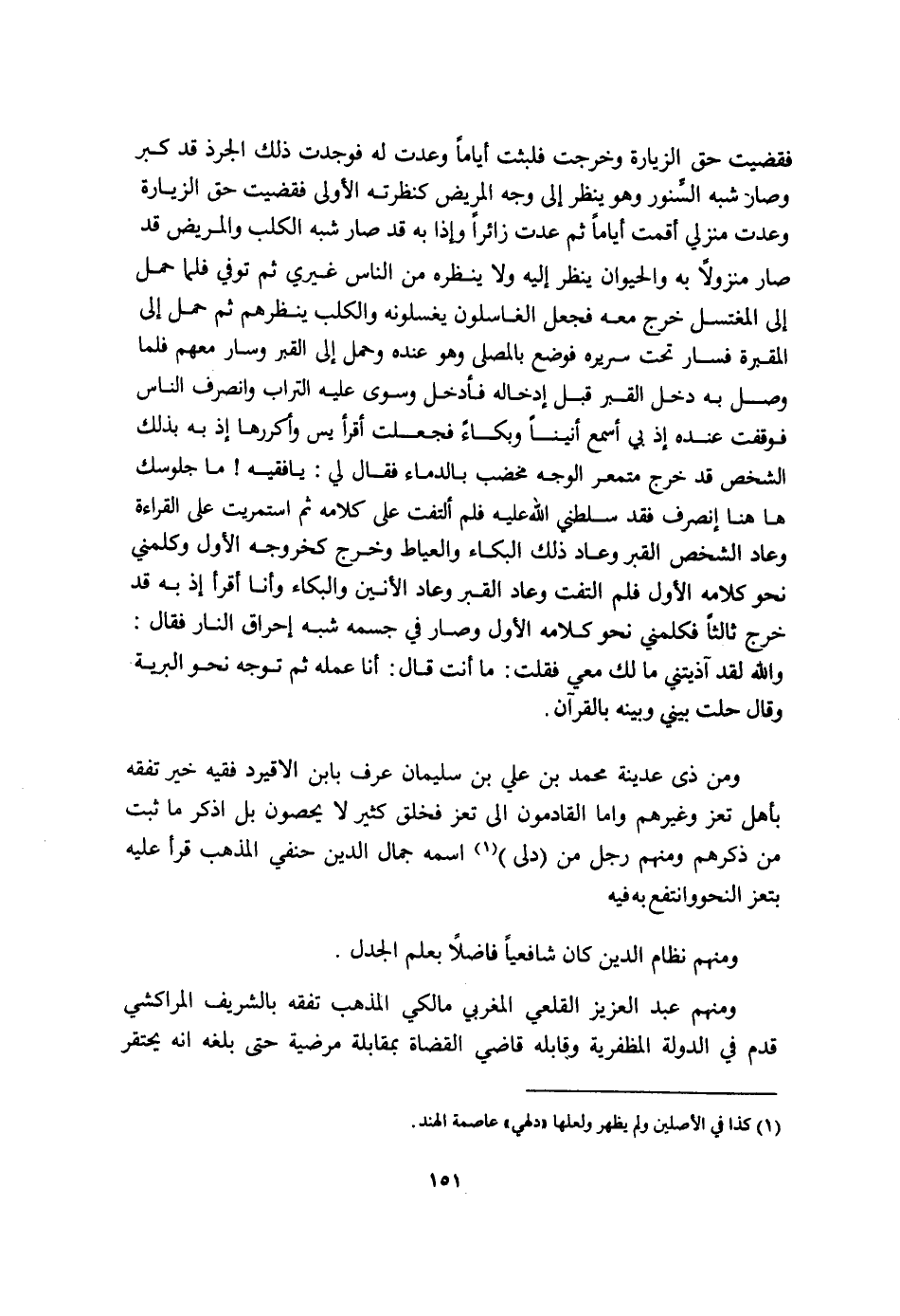 فَقضيت حق الزِّيَارَة وَخرجت فَلَبثت أَيَّامًا وعدت لَهُ فَوجدت ذَلِك الجرذ قد كبر وَصَارَ شبه السنور وَهُوَ ينظر إِلَى وَجه الْمَرِيض كنظرته الاولى فَقضيت حق الزِّيَارَة وعدت منزلي أَقمت أَيَّامًا ثمَّ عدت زَائِرًا وَإِذا بِهِ قد صَار شبه الْكَلْب وَالْمَرِيض قد صَار منزولا بِهِ وَالْحَيَوَان ينظر إِلَيْهِ وَلَا ينظره من النَّاس غَيْرِي ثمَّ توفّي فَلَمَّا حمل إِلَى المغتسل خرج مَعَه فَجعل الغاسلون يغسلونه وَالْكَلب ينظرهم ثمَّ حمل إِلَى الْمقْبرَة فَسَار تَحت سَرِيره فَوضع بالمصلى وَهُوَ عِنْده وَحمل إِلَى الْقَبْر وَسَار مَعَهم فَلَمَّا وصل بِهِ دخل الْقَبْر قبل إِدْخَاله فَأدْخل وَسوى عَلَيْهِ التُّرَاب وَانْصَرف النَّاس فوقفت عِنْده إِذْ بِي أسمع أنينا وبكاء فَجعلت أقرا يس وأكررها إِذْ بِهِ بذلك الشَّخْص قد خرج متمعر الْوَجْه مخضب بالدماء فَقَالَ لي يَا فَقِيه مَا جلوسك هَا هُنَا إنصرف فقد سَلطنِي الله عَلَيْهِ فَلم ألتفت على كَلَامه ثمَّ استمريت على الْقِرَاءَة وَعَاد الشَّخْص الْقَبْر وَعَاد ذَلِك الْبكاء والعياط وَخرج كخروجه الأول وكلمني نَحْو كَلَامه الأول فَلم الْتفت وَعَاد الْقَبْر وَعَاد الأنين والبكاء وَأَنا أقرا إِذْ بِهِ قد خرج ثَالِثا فكلمني نَحْو كَلَامه الأول وَصَارَ فِي جِسْمه شبه إراق النَّار فَقَالَ وَالله لقد آذيتني مَا لَك معي فَقلت مَا أَنْت قَالَ أَنا عمله ثمَّ توجه نَحْو الْبَريَّة وَقَالَ حلت بيني وَبَينه بِالْقُرْآنِ