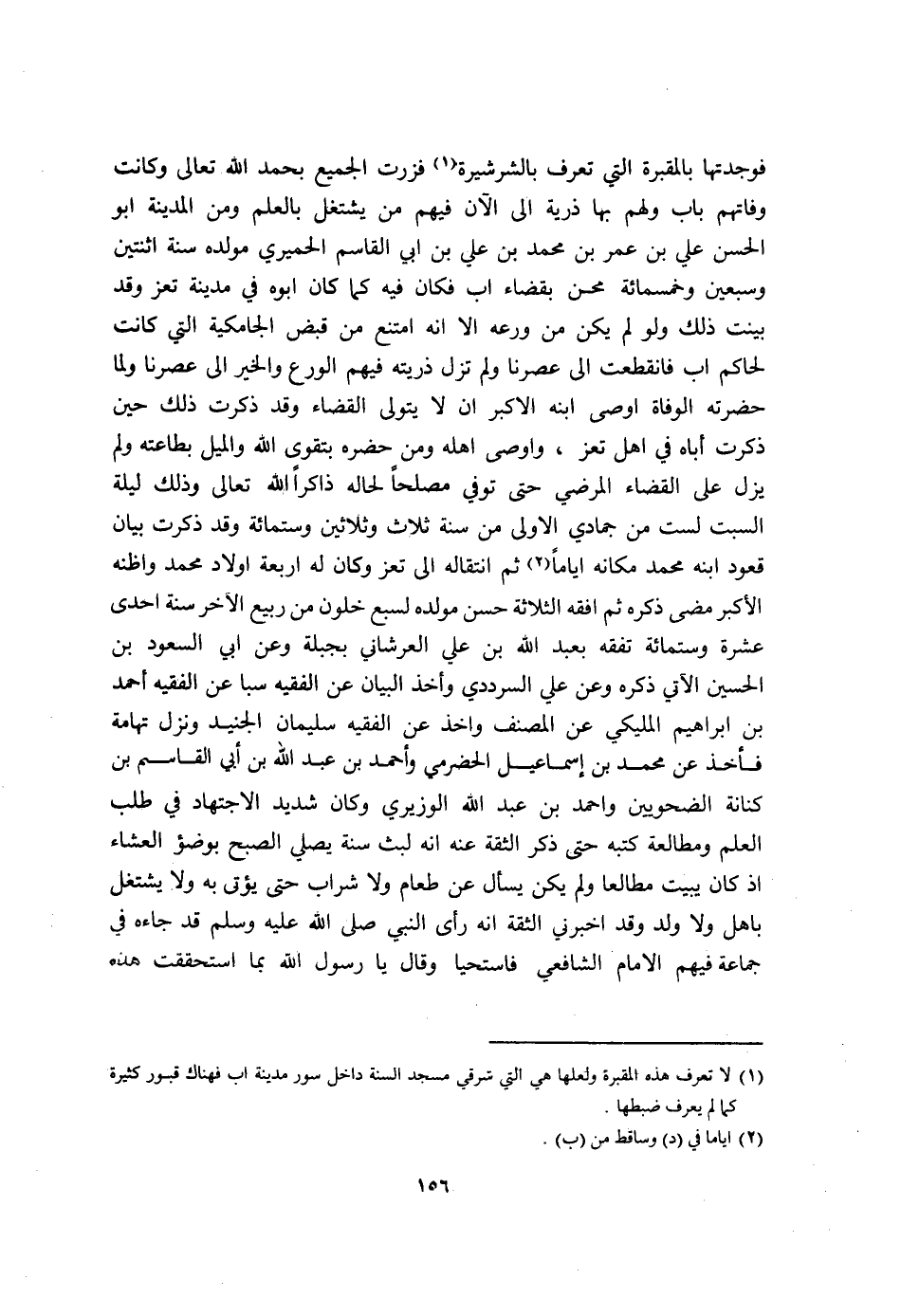 فَوَجَدتهَا بالمقبرة الَّتِي تعرف بالشرشيرة فزرت الْجَمِيع بِحَمْد الله تَعَالَى وَكَانَت وفاتهم بَاب وَلَهُم بهَا ذُرِّيَّة الى الْآن فيهم من يشْتَغل بِالْعلمِ وَمن الْمَدِينَة ابو الْحسن عَليّ بن عمر بن مُحَمَّد بن عَليّ بن ابي الْقَاسِم الْحِمْيَرِي مولده سنة اثْنَتَيْنِ وَسبعين وَخَمْسمِائة محن بِقَضَاء اب فَكَانَ فِيهِ كَمَا كَانَ ابوه فِي مَدِينَة تعز وَقد بيّنت ذَلِك وَلَو لم يكن من ورعه الا انه امْتنع من قبض الجامكية الَّتِي كَانَت لحَاكم ابْن فَانْقَطَعت الى عصرنا وَلم تزل ذُريَّته فيهم الْوَرع وَالْخَيْر الى عصرنا وَلما حَضرته الْوَفَاة اوصى ابْنه الاكبر ابْن لَا يتَوَلَّى الْقَضَاء وَقد ذكرت ذَلِك حِين ذكرت أَبَاهُ فِي اهل تعز واوصى اهله وَمن حَضَره بتقوى الله والميل بِطَاعَتِهِ وَلم يزل على الْقَضَاء المرضي حَتَّى توفّي مصلحا لحاله ذَاكِرًا لله تَعَالَى وَذَلِكَ لَيْلَة السبت لست من جمادي الاولى من سنة ثَلَاث وَثَلَاثِينَ وسِتمِائَة وَقد ذكرت بَيَان قعُود ابْنه مُحَمَّد مَكَانَهُ اياما ثمَّ انْتِقَاله الى تعز وَكَانَ لَهُ اربعة اولاد مُحَمَّد واظنه الاكبر مضى ذكره ثمَّ افقه الثَّلَاثَة حسن مولده لسبع خلون من ربيع الاخر سنة احدى عشرَة وسِتمِائَة تفقه بِعَبْد الله بن عَليّ العرشاني بجبلة وَعَن ابي السُّعُود بن الْحُسَيْن الَّاتِي ذكره وَعَن عَليّ السرددي وَأخذ الْبَيَان عَن الْفَقِيه سبا عَن الْفَقِيه احْمَد بن ابراهيم الْمليكِي عَن المُصَنّف واخذ عَن الْفَقِيه سُلَيْمَان الْجُنَيْد وَنزل تهَامَة فَأخذ عَن مُحَمَّد بن إِسْمَاعِيل الْحَضْرَمِيّ وَأحمد بن عبد الله بن أبي الْقَاسِم بن كنَانَة الضحويين وَاحْمَدْ بن عبد الله الوزيري وَكَانَ شَدِيد الِاجْتِهَاد فِي طلب الْعلم ومطالعة كتبه حَتَّى ذكر الثِّقَة عَنهُ انه لبث سنة يُصَلِّي الصُّبْح بوضؤ الْعشَاء اذ كَانَ يبيت مطالعا وَلم يكن يسْأَل عَن طَعَام وَلَا شراب حَتَّى يُؤْتى بِهِ وَلَا يشْتَغل بَاهل وَلَا ولد وَقد اخبرني الثِّقَة انه رأى النَّبِي صلى الله عَلَيْهِ وَسلم قد جَاءَهُ فِي جمَاعَة فيهم الامام الشَّافِعِي فاستحيا وَقَالَ يَا رَسُول الله بِمَا استحققت هَذِه