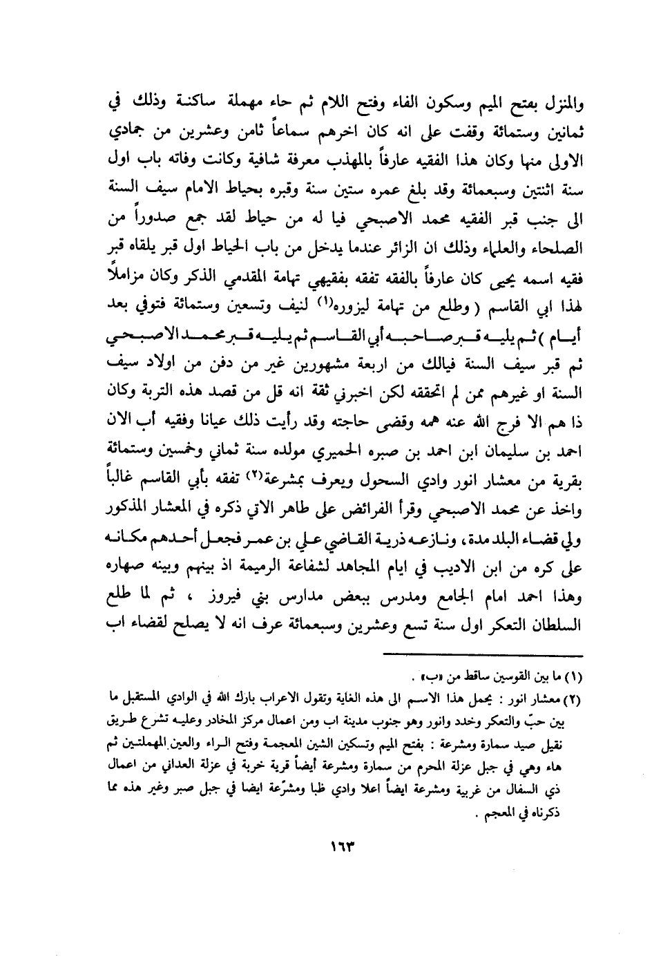 والمنزل بِفَتْح الْمِيم وَسُكُون الْفَاء وَفتح الام ثمَّ حاء مُهْملَة سَاكِنة وَذَلِكَ فِي ثَمَانِينَ وسِتمِائَة وقفت على انه كَانَ اخرهم سَمَاعا ثامن وَعشْرين من جمادي الاولى مِنْهَا وَكَانَ هَذَا الْفَقِيه عَارِفًا بالمهذب معرفَة شافية وَكَانَت وَفَاته بَاب اول سنة اثْنَتَيْنِ وَسَبْعمائة وَقد بلغ عمره سِتِّينَ سنة وقبره بحياط الامام سيف السّنة الى جنب قبر الْفَقِيه مُحَمَّد الاصبحي فيا لَهُ من حياط لقد جمع صدورا من الصلحاء وَالْعُلَمَاء وَذَلِكَ ان الزائر عِنْدَمَا يدْخل من بَاب الحياط اول قبر يلقاه قبر فَفِيهِ اسْمه يحيى كَانَ عَارِفًا بالفقه تفقه بفقيهي تهَامَة الْمقدمِي الذّكر وَكَانَ مزاملا لهَذَا ابي الْقَاسِم وطلع من تهَامَة ليزوره لنيف وَتِسْعين وسِتمِائَة فَتوفي بعد ايام ثمَّ يَلِيهِ قبر صَاحبه أبي الْقَاسِم ثمَّ يَلِيهِ قبر مُحَمَّد الاصبحي ثمَّ قبر سيف السّنة فِي لَك من اربعة مشهورين غير من دفن من اولاد سيف السّنة اَوْ غَيرهم مِمَّن لم اتحققه لَكِن اخبرني ثِقَة انه قل من قصد هَذِه التربة وَكَانَ ذَا هم الا فرج الله عَنهُ همه وَقضى حَاجته وَقد رَأَيْت ذَلِك عيَانًا وفقيه أَب الان احْمَد بن سُلَيْمَان ابْن احْمَد بن صبره الْحِمْيَرِي مولده سنة ثَمَانِي وخسمين وسِتمِائَة بقرية من معشار انور وَادي السحول وَيعرف بمشرعة تفقه بِأبي الْقَاسِم غَالِبا واخذ عَن مُحَمَّد الاصبحي وَقَرَأَ الْفَرَائِض على طَاهِر الَّاتِي ذكره فِي المعشار الْمَذْكُور ولي قَضَاء الْبَلَد مُدَّة ونازعه ذُرِّيَّة القَاضِي عَليّ بن عمر فَجعل أحدهم مَكَانَهُ على كره من ابْن الاديب فِي أَيَّام الْمُجَاهِد لشفاعة الرميمة اذ بَينهم وَبَينه صهاره وَهَذَا احْمَد امام الْجَامِع ومدرس بِبَعْض مدارس بني فَيْرُوز ثمَّ لما طلع السُّلْطَان التعكر اول سنة تسع وَعشْرين وَسَبْعمائة عرف انه لَا يصلح لقَضَاء اب