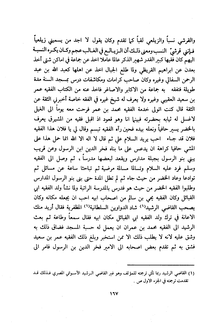 والقرشي نسبا والزيلعي لقبا كَمَا تقدم وَكَانَ يَقُول لَا اجد من يسميني زيلعيا فإنني قرشي النّسَب وَمعنى ذَلِك أَن الزيالع فِي الْغَالِب عجم وَكَانَ يكره النِّسْبَة اليهم كَانَ فَقِيها كَبِير الْقدر شهير الذّكر عَالما عَاملا اخذ عَن جمَاعَة فِي أَمَاكِن شَتَّى أَخذ بعدن عَن ابراهيم القريظي وَلما طلع الْجبَال اخذ عَن اهلها كَعبد الله بن عبد الرَّحْمَن السفالي وَغَيره وَكَانَ صَاحب كرامات ومكاشفات درس بِمَسْجِد السّنة مُدَّة طَوِيلَة فتفقه بِهِ جمَاعَة من الاكابر والاصاغر فاخذ عَنهُ من الْكتاب الْفَقِيه عمر بن سعيد العقيبي وَغَيره وَلَا يعرف لَهُ شيخ غَيره فِي الْفِقْه خَاصَّة أَخْبرنِي الثِّقَة عَن الثِّقَة قَالَ كنت اتولى خدمَة الْفَقِيه مُحَمَّد بن عمر فرحت مَعَه يَوْمًا الى الغيل لاغسل لَهُ ثِيَابه بِحَضْرَتِهِ فَبَيْنَمَا انا وَهُوَ قعُود اذ اقبل فَقِيه من المشيرق يعرف بالخضر يسير حافيا وَنَعله بِيَدِهِ فحين رَآهُ الْفَقِيه تَبَسم وَقَالَ لي يَا فلَان هَذَا الْفَقِيه فلَان قد جَاءَ احب يُرِيد السَّلَام عَليّ ثمَّ قَالَ لَا اله الا الله انما حمل هَذَا على الْمَشْي حافيا كَرَاهَة ان يدعس على مَا بناه فَخر الدّين ابْن الرَّسُول وَعَن قريب يَبْنِي بَنو الرَّسُول بجبلة مدارس وَيقْعد لبعضها مدرسا ثمَّ وصل الى الْفَقِيه وَسلم فَرد عَلَيْهِ السَّلَام وتسالما مسالمة مرضية ثمَّ تباحثا سَاعَة عَن مسَائِل ثمَّ توادعا وَعَاد الْخضر من حَيْثُ جَاءَ ثمَّ لم تطل الْمدَّة حَتَّى بني بَنو الرَّسُول الْمدَارِس وطلبوا الْفَقِيه الْخضر من حَيْثُ هُوَ فدرس بِالْمَدْرَسَةِ الرَّاتِبَة وَلما نَشأ ولد الْفَقِيه ابي الْقَبَائِل وَكَانَ الْفَقِيه يحي بن سَالم من اصحاب ابيه احب ان يَجعله مَكَانَهُ وَكَانَ يصحب القَاضِي الرشيد شاد الدَّوَاوِين السُّلْطَانِيَّة المظفرية فَقَالَ أُرِيد مِنْك الاعانة فِي ترك ولد الْفَقِيه ابي الْقَبَائِل مَكَان ابيه فَقَالَ سمعا وَطَاعَة ثمَّ بعث الرشيد الى الْفَقِيه مُحَمَّد بن عمرَان ان يعْمل لَهُ حسبَة الْمَسْجِد فَضَاقَ ذَلِك بِهِ وشق عَلَيْهِ لانه لَا يطْلب ذَلِك الا مِمَّن استخبر وَبلغ ذَلِك الْفَقِيه عمر بن سعيد فشق بِهِ ثمَّ تقدم بعض اصحابه الى الامير فَخر الدّين بن الرَّسُول فامر الى
