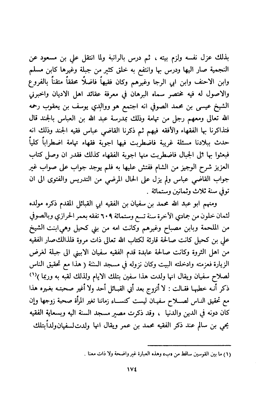 وَمِنْهُم ابو عبد الله مُحَمَّد بن سُفْيَان بن الْفَقِيه ابي الْقَبَائِل الْمُقدم ذكره مولده لثمان خلون من جمادي الْآخِرَة سنة تسع وسِتمِائَة 609 تفقه بعمر الْحرَازِي وبالصوفي من الملحمة وبابن مِصْبَاح وَغَيرهم وَكَانَت امهِ من بني كحيل وَهِي ابنت الشَّيْخ عَليّ بن كحيل كَانَت صَالِحَة قارئة لكتاب الله تَعَالَى ذَات مروة فَلذَلِك صَار الْفَقِيه من أهل الثروة وَكَانَت صَالِحَة عابدة قدم الْفَقِيه سُفْيَان الابيني إِلَى جبلة لغَرَض الزِّيَارَة فعزمته وادخلته الْبَيْت وَكَانَ نُزُوله فِي مَسْجِد السّنة هَذَا مَعَ تَحْقِيق النَّاس لصلاح سُفْيَان وَيُقَال أَنَّهَا ولدت هَذَا سفين بِتِلْكَ الايام وَلذَلِك لقبه بِهِ وَرُبمَا ذكر أَنه خطبهَا فَقَالَت لَا أَتزوّج بعد أبي الْقَبَائِل أحد وَلَا أغير صحبته بِغَيْرِهِ هَذَا مَعَ تَحْقِيق النَّاس لصلاح سُفْيَان لَيست كنساء زَمَاننَا تغير الْمَرْأَة صُحْبَة زَوجهَا وَإِن كَانَ دونه فِي الدّين والدينا وَقد ذكرت مصير مَسْجِد السّنة اليه وبسعاية الْفَقِيه يحي بن سَالم عِنْد ذكر الْفَقِيه مُحَمَّد بن عمر وَيُقَال انها ولدت لِسُفْيَان ولدا بِتِلْكَ