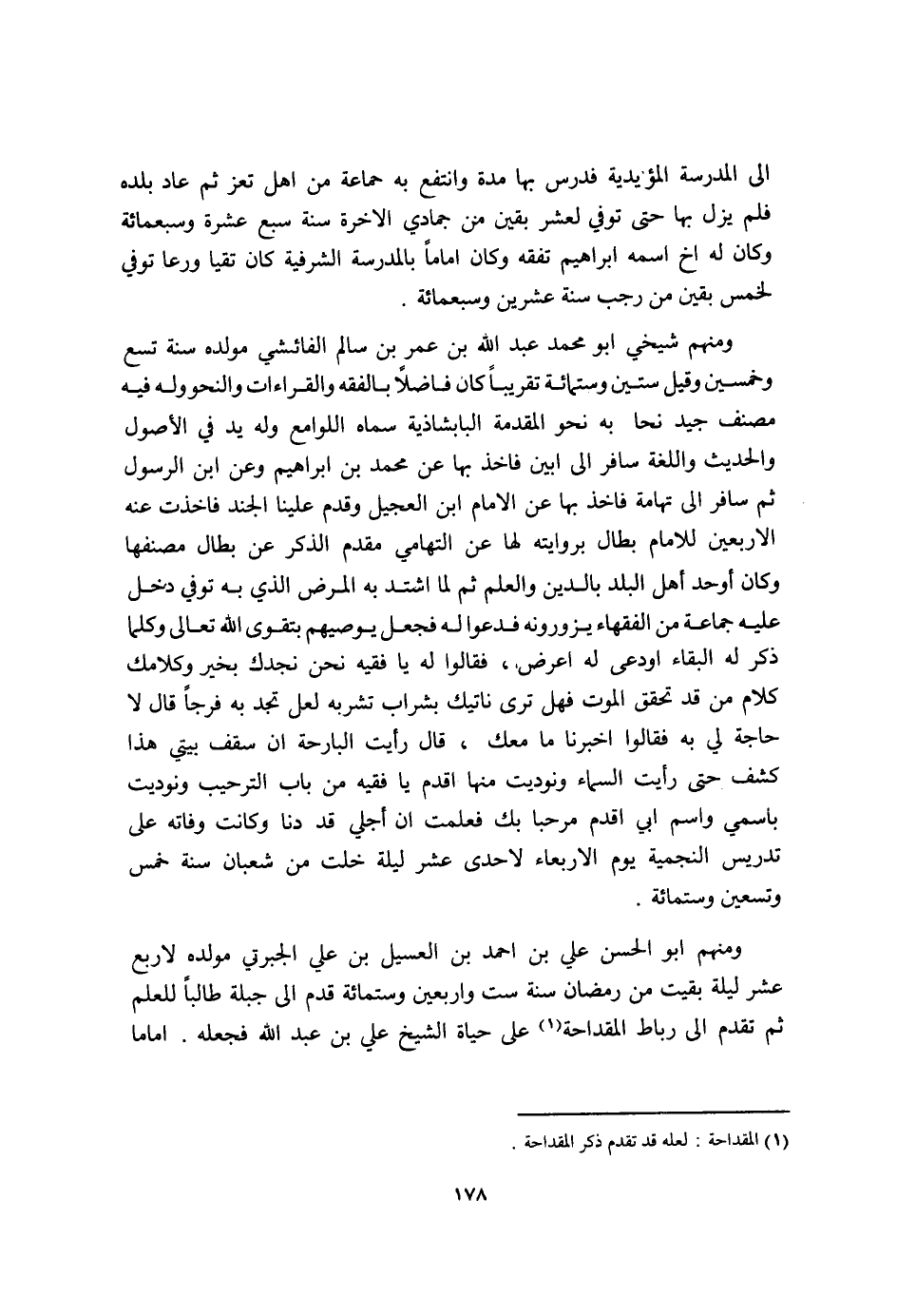 وَمِنْهُم شَيْخي ابو مُحَمَّد عبد الله بن عمر بن سَالم الفائشي مولده سنة تسع وَخمسين وَقيل سِتِّينَ وسِتمِائَة تَقْرِيبًا كَانَ فَاضلا بالفقه والقراءات والنحو وَله فِيهِ مُصَنف جيد نحا بِهِ نَحْو الْمُقدمَة البابشاذية سَمَّاهُ اللوامع وَله يَد فِي الْأُصُول والْحَدِيث واللغة سَافر الى ابين فاخذ بهَا عَن مُحَمَّد بن ابراهيم وَعَن ابْن الرَّسُول ثمَّ سَافر الى تهَامَة فاخذ بهَا عَن الامام ابْن العجيل وَقدم علينا الْجند فاخذت عَنهُ الاربعين للامام بطال بروايته لَهَا عَن التهاملي مقدم الذّكر عَن بطال مصنفها وَكَانَ أوحد أهل الْبَلَد بِالدّينِ الْعلم ثمَّ لما اشْتَدَّ بِهِ الْمَرَض الَّذِي بِهِ توفّي دخل عَلَيْهِ جمَاعَة من الْفُقَهَاء يزورونه فدعوا لَهُ فَجعل يوصيهم بتقوى الله تَعَالَى وَكلما ذكر لَهُ الْبَقَاء اودعى لَهُ اعْرِض فَقَالُوا لَهُ يَا فَقِيه نَحن نجدك بِخَير وكلامك كَلَام من قد تحقق الْمَوْت فَهَل ترى ناتيك بشراب تشربه لَعَلَّ تَجِد بِهِ فرجا قَالَ لَا حَاجَة لي بِهِ فَقَالُوا اُخْبُرْنَا مَا مَعَك قَالَ رَأَيْت البارحة ان سقف بَيْتِي هَذَا كشف حَتَّى رَأَيْت السَّمَاء ونوديت مِنْهَا اقدم يَا فَقِيه من بَاب الترحيب ونوديت باسمي وَاسم ابي اقدم مرْحَبًا بك فَعلمت ان أَجلي قد دنا وَكَانَت وَفَاته على تدريس النجمية يَوْم الاربعاء لاحدى عشر لَيْلَة خلت من شعْبَان سنة خمس وَتِسْعين وسِتمِائَة