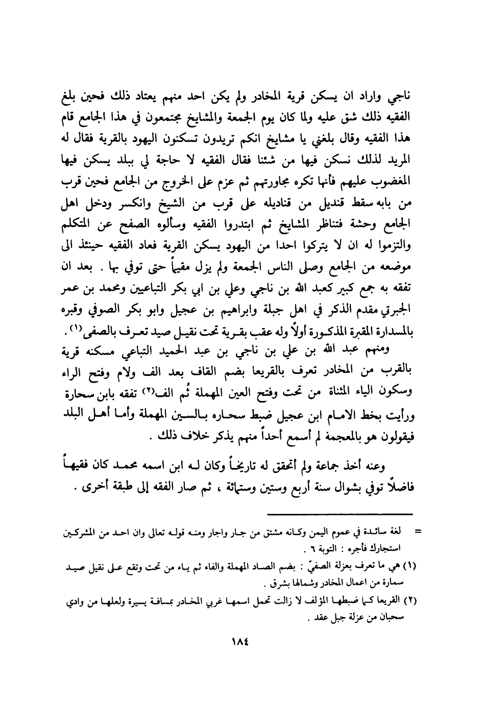 وَمِنْهُم عبد الله بن عَليّ بن نَاجِي بن عبد الحميد التباعي مَسْكَنه قَرْيَة بِالْقربِ من المخادر تعرف بالقريعا بِضَم الْقَاف بعد الف وَلَام وَفتح الرَّاء وَسُكُون الْيَاء الْمُثَنَّاة من تَحت وَفتح الْعين الْمُهْملَة ثمَّ الف تفقه بِابْن سحارة وَرَأَيْت بِخَط الامام ابْن عجيل ضبط سحاره بِالسِّين الْمُهْملَة وَأما أهل الْبَلَد فَيَقُولُونَ هُوَ بِالْمُعْجَمَةِ لم أسمع أحدا مِنْهُم يذكر خلاف ذَلِك