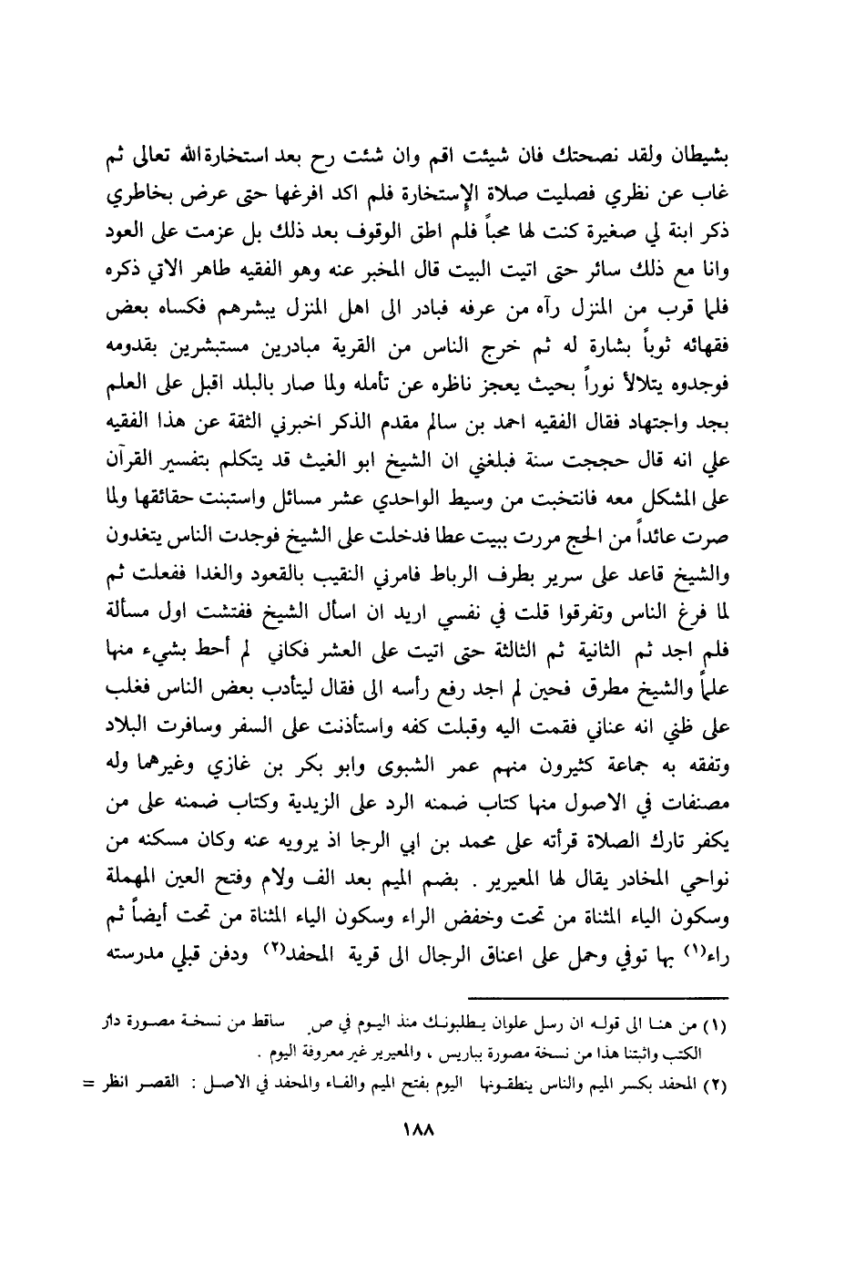 بِشَيْطَان وَلَقَد نَصَحْتُك فَإِن شيئت اقم وان شِئْت رح بعد استخارة الله تَعَالَى ثمَّ غَابَ عَن نَظَرِي فَصليت صَلَاة الإستخارة فَلم اكد افرغها حَتَّى عرض بخاطري ذكر ابْنة لي صَغِيرَة كنت لهامحبا فَلم اطق الْوُقُوف بعد ذَلِك بل عزمت على الْعود وانا مَعَ ذَلِك سَائِر حَتَّى اتيت الْبَيْت قَالَ الْمخبر عَنهُ وَهُوَ الْفَقِيه طَاهِر الَّاتِي ذكره فَلَمَّا قرب من الْمنزل رَآهُ من عرفه فبادر الى اهل الْمنزل يبشرهم فَكَسَاهُ بعض فقهائه ثوبا بِشَارَة لَهُ ثمَّ خرج النَّاس من الْقرْيَة مبادرين مستبشرين بقدومه فوجدوه يتلألأ نورا بِحَيْثُ يعجز ناظره عَن تَأمله وَلما صَار بِالْبَلَدِ اقبل على الْعلم بجد واجتهاد فَقَالَ الْفَقِيه احْمَد بن سَالم مقدم الذّكر اخبرني الثِّقَة عَن هَذَا الْفَقِيه عَليّ انه قَالَ حججْت سنة فبلغني ان الشَّيْخ ابو الْغَيْث قد يتَكَلَّم بتفسير القرأن على الْمُشكل مَعَه فانتخبت من وسيط الواحدي عشر مسَائِل واستبنت حقائقها وَلما صرت عَائِدًا من الْحَج مَرَرْت بِبَيْت عطا فَدخلت على الشَّيْخ فَوجدت النَّاس يتغدون وَالشَّيْخ قَاعد على سَرِير بِطرف الرِّبَاط فامرني النَّقِيب بالقعود والغدا فَفعلت ثمَّ لما فرغ النَّاس وَتَفَرَّقُوا قلت فِي نَفسِي اريد ان اسْأَل الشَّيْخ ففتشت اول مَسْأَلَة فَلم اجد ثمَّ الثَّانِيَة ثمَّ الثَّالِثَة حَتَّى اتيت على الْعشْر فكاني لم أحط بِشَيْء مِنْهَا علما وَالشَّيْخ مطرق فحين لم اجد رفع رَأسه الى فَقَالَ ليتأدب بعض النَّاس فغلب على ظَنِّي انه عناني فَقُمْت اليه وَقبلت كَفه واستأذنت على السّفر وسافرت الْبِلَاد وتفقه بِهِ جمَاعَة كَثِيرُونَ مِنْهُم عمر الشبوي وابوبكر بن غَازِي وغيرهماوله مصنفات فِي الاصول مِنْهَا كتاب ضمنه الرَّد على الزيدية وَكتاب ضمنه على من يكفر تَارِك الصَّلَاة قرأته على مُحَمَّد بن ابي الرجا اذ يرويهِ عَنهُ وَكَانَ مَسْكَنه من نواحي المخادر يُقَال لهاا المعيرير