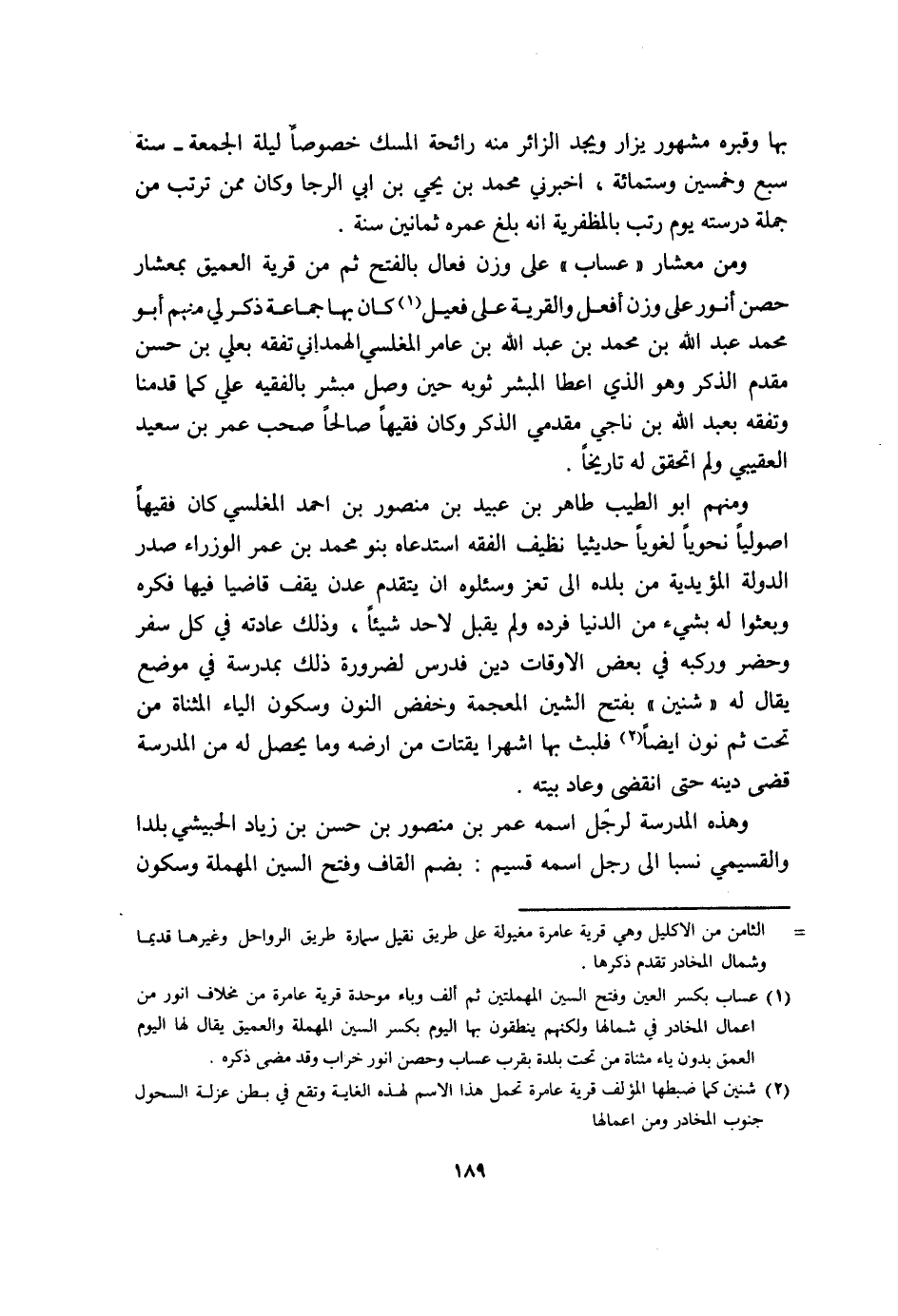 وَمن معشار عساب على وزن فعال بِالْفَتْح ثمَّ من قَرْيَة العميق بمعشار حصن أنور على وزن أفعل والقرية على فعيل كَانَ بهَا جمَاعَة ذكر لي مِنْهُم أَبُو مُحَمَّد عبد الله بن مُحَمَّد بن عبد الله بن عَامر المغلسي الْهَمدَانِي تفقه بعلي بن حسن مقدم الذّكر وَهُوَ الَّذِي اعطا المبشر ثَوْبه حِين وصل مُبشر بالفقيه عَليّ كَمَا قدمنَا وتفقه بِعَبْد الله بن نَاجِي مقدمي الذّكر وَكَانَ فَقِيها صَالحا صحب عمر بن سعيد العقيبي وَلم اتحقق لَهُ تَارِيخا