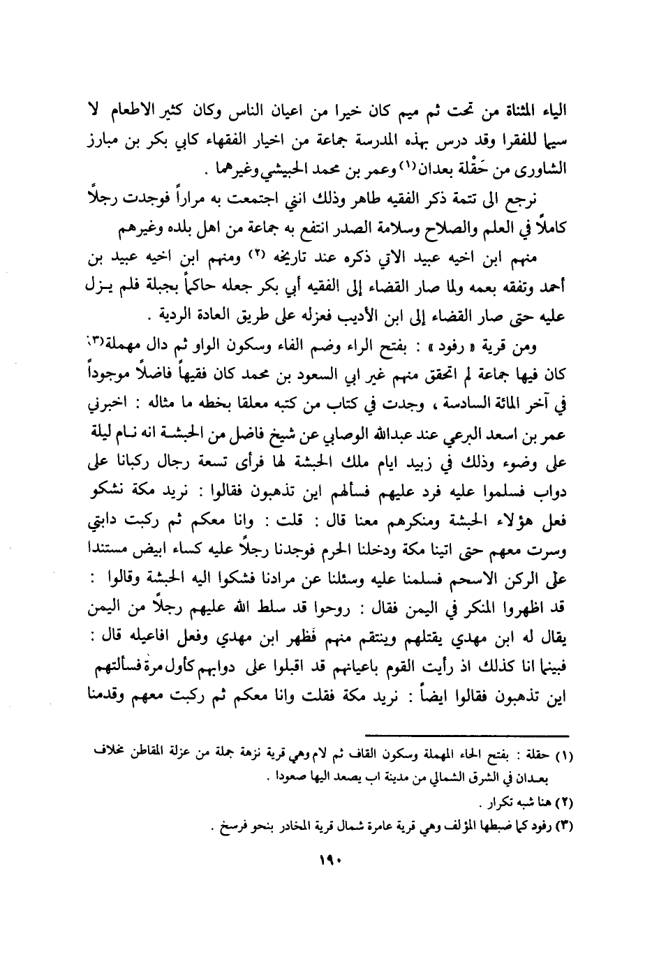وَمن قَرْيَة رفود بِفَتْح الرَّاء وَضم الْفَاء وَسُكُون الْوَاو ثمَّ دَال مُهْملَة كَانَ فِيهَا جمَاعَة لم اتحقق مِنْهُم غير ابي السُّعُود بن مُحَمَّد كَانَ فَقِيها فَاضلا مَوْجُودا فِي آخر الْمِائَة السَّادِسَة وجدت فِي كتاب من كتبه مُعَلّقا بِخَطِّهِ مَا مِثَاله اخبرني عمر بن اِسْعَدْ البرعي عِنْد عبد الله الوصابي عَن شيخ فَاضل من الْحَبَشَة انه نَام لَيْلَة على وضوء وَذَلِكَ فِي زبيد ايام ملك الْحَبَشَة لَهَا فَرَأى تِسْعَة رجال ركبانا على دَوَاب فَسَلمُوا عَلَيْهِ فَرد عَلَيْهِم فَسَأَلَهُمْ ايْنَ تذهبون فَقَالُوا نُرِيد مَكَّة نشكو فعل هَؤُلَاءِ الْحَبَشَة ومنكرهم مَعنا قَالَ قلت وَأَنا مَعكُمْ ثمَّ ركبت دَابَّتي وسرت مَعَهم حَتَّى اتينا مَكَّة ودخلنا الْحرم فَوَجَدنَا رجلا عَلَيْهِ كسَاء ابيض مُسْتَندا على الرُّكْن الاسحم فسلمنا عَلَيْهِ وسئلنا عَن مرادنا فشكوا اليه الْحَبَشَة وَقَالُوا قد أظهرُوا الْمُنكر فِي الْيمن فَقَالَ روحوا قد سلط الله عَلَيْهِم رجلا من الْيمن يُقَال لَهُ ابْن مهْدي يقتلهُمْ وينتقم مِنْهُم فَظهر ابْن مهْدي وَفعل افاعيله قَالَ فَبَيْنَمَا انا كَذَلِك اذ رايت الْقَوْم باعيانهم قد اقْبَلُوا على دوابهم كأول مرّة فسألتهم ايْنَ تذهبون فَقَالُوا ايضا نُرِيد مَكَّة فَقلت وَأَنا مَعكُمْ ثمَّ ركبت مَعَهم وَقدمنَا