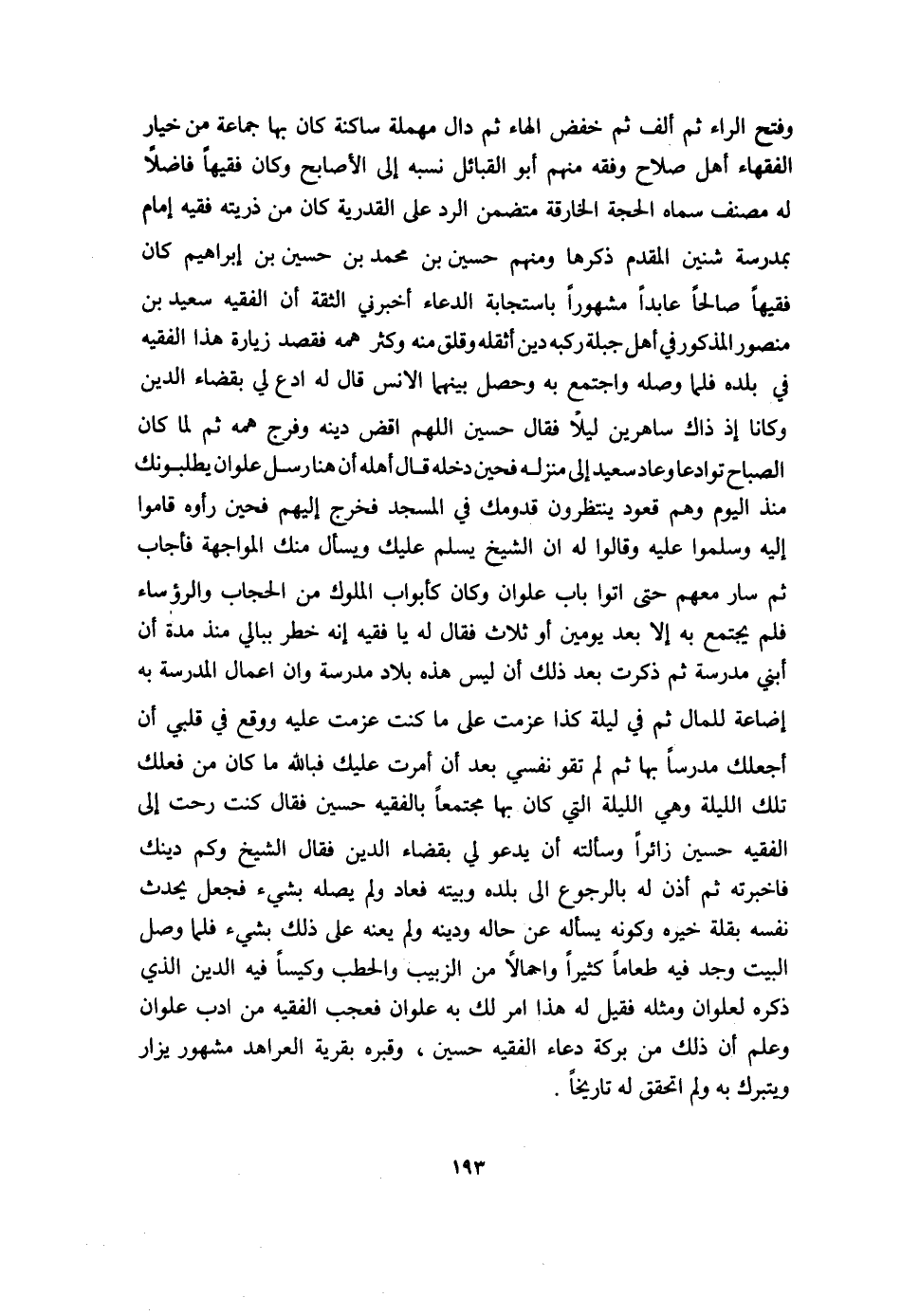 وَفتح الرَّاء ثمَّ الف ثمَّ خفض الْهَاء ثمَّ دالمهملة سَاكِنة كَانَ بهَا جمَاعَة من خِيَار الْفُقَهَاء أهل صَلَاح وَفقه مِنْهُم أَبُو الْقَبَائِل نسبه إِلَى الأصابح وَكَانَ فَقِيها فَاضلا لَهُ مُصَنف سَمَّاهُ الْحجَّة الخارقة مُتَضَمّن الرَّد على الْقَدَرِيَّة كَانَ من ذُريَّته فَقِيه إِمَام بمدرسة شنين الْمُقدم ذكرهَا وَمِنْهُم حُسَيْن بن مُحَمَّد بن حُسَيْن بن إِبْرَاهِيم كَانَ فَقِيها صَالحا عبادا مَشْهُورا باستجابة الدُّعَاء أَخْبرنِي الثِّقَة أَن الْفَقِيه سعيد بن مَنْصُور الْمَذْكُور فِي أهل جبلة رَكبه دين أثقله وقلق مِنْهُ وَكثر همه فقصد زِيَارَة هَذَا الْفَقِيه فِي بَلَده فَلَمَّا وَصله وَاجْتمعَ بِهِ وَحصل بَينهمَا الانس قَالَ لَهُ ادْع لي بِقَضَاء الدّين وَكَانَا إِذْ ذَاك ساهرين لَيْلًا فَقَالَ حُسَيْن اللَّهُمَّ اقْضِ دينه وَفرج همه ثمَّ لما كَانَ الصَّباح توادعا وَعَاد سعيد إِلَى منزله فحين دخله قَالَ أَهله أَن هُنَا رسل علوان يطلبونك مُنْذُ الْيَوْم وهم قعُود ينتظرون قدومك فِي الْمَسْجِد فَخرج إِلَيْهِم فحين رَأَوْهُ قَامُوا إِلَيْهِ وسلموا عَلَيْهِ وَقَالُوا لَهُ ان الشَّيْخ يسلم عَلَيْك وَيسْأل مِنْك المواجهة فَأجَاب ثمَّ سَار مَعَهم حَتَّى اتوا بَاب علوان وَكَانَ كابواب الْمُلُوك من الْحجاب والرؤساء فَلم يجْتَمع بِهِ إِلَّا بعد يَوْمَيْنِ أَو ثَلَاث فَقَالَ لَهُ يَا فَقِيه إِنَّه خطر ببالي مُنْذُ مُدَّة أَن ابْني مدرسة ثمَّ ذكرت بعد ذَلِك أَن لَيْسَ هَذِه بِلَاد مدرسة وان اعمال الْمدرسَة بِهِ إِضَاعَة لِلْمَالِ ثمَّ فِي لَيْلَة كَذَا عزمت على مَا كنت عزمت عَلَيْهِ وَوَقع فِي قلبِي أَن أجعلك مدرسا بهَا ثمَّ لم تقو نَفسِي بعد أَن امرت عَلَيْك فبالله مَا كَانَ من فعلك تِلْكَ اللَّيْلَة وَهِي اللَّيْلَة الَّتِي كَانَ بهَا مجتمعا بالفقيه حُسَيْن فَقَالَ كنت رحت إِلَى الْفَقِيه حُسَيْن زَائِرًا وَسَأَلته أَن يَدْعُو لي بِقَضَاء الدّين فَقَالَ الشَّيْخ وَكم دينك فاخبرته ثمَّ أذن لَهُ بِالرُّجُوعِ إِلَى بَلَده وبيته فَعَاد وَلم يصله بِشَيْء فَجعل يحدث نَفسه بقلة خَيره وَكَونه يسْأَله عَن حَاله وَدينه وَلم يعنه على ذَلِك بِشَيْء فَلَمَّا وصل الْبَيْت وجد فِيهِ طَعَاما كثيرا واحمالا من الزَّبِيب والحطب وكيسا فِيهِ الدّين الَّذِي ذكره لعلوان وَمثله فَقيل لَهُ هَذَا امْر لَك بِهِ علوان فَعجب الْفَقِيه من ادب علوان وَعلم ان ذَلِك من بركَة دُعَاء الْفَقِيه حُسَيْن وقبره بقرية العراهد مَشْهُور يزار ويتبرك بِهِ وَلم اتحقق لَهُ تَارِيخا