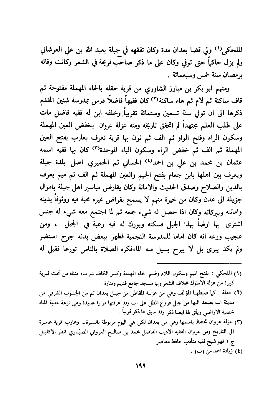 وَخَلفه ابْن لَهُ فَقِيه فَاضل مَاتَ على طلب الْعلم مُجْتَهدا لم اتحقق تَارِيخ وَمِنْه عزلة عروان بخفض الْعين الْمُهْملَة وَسُكُون الرَّاء وَفتح الْوَاو ثمَّ الف ثمَّ نون بهَا قَرْيَة تعرف بعارب بفتحالعين الْمُهْملَة ثمَّ الف ثمَّ خفض الرَّاء وَسُكُون الْبَاء الْمُوَحدَة كَانَ بهَا فَقِيه اسْمه عُثْمَان بن مُحَمَّد بن عَليّ بن احْمَد الحساني ثمَّ الْحِمْيَرِي اصل بَلْدَة جبلة وَيعرف بَين اهلها بِابْن جعام بِفَتْح الْجِيم وَالْعين الْمُهْملَة ثمَّ الف ثمَّ مِيم يعرف بِالدّينِ وَالصَّلَاح وَصدق الحَدِيث والامانة وَكَانَ يقارض مياسير اهل جبلة باموال جزيلة الى عدن وَكَانَ من خيرة مِنْهُم لَا يسمح بقراض غَيره محبَّة فِيهِ ووثوقا بِدِينِهِ وامانته وببركاته وَكَانَ اذا حصل لَهُ شَيْء جُمُعَة ثمَّ لما اجْتمع مَعَه شَيْء لَهُ جنس اشْترى بهَا ارضا بِهَذَا الْجَبَل فسكنه وبورك لَهُ فِيهِ رَغْبَة فِي الْجَبَل وَمن عَجِيب ورعه انه كَانَ اماما للمدرسة النجمية فَظهر بِبَعْض بدنه جرح استضر وَلم يكد يبرى بل لَا يبرح يسيل مِنْهُ المَاء فكره الصَّلَاة بِالنَّاسِ تورعا فَقيل لَهُ
