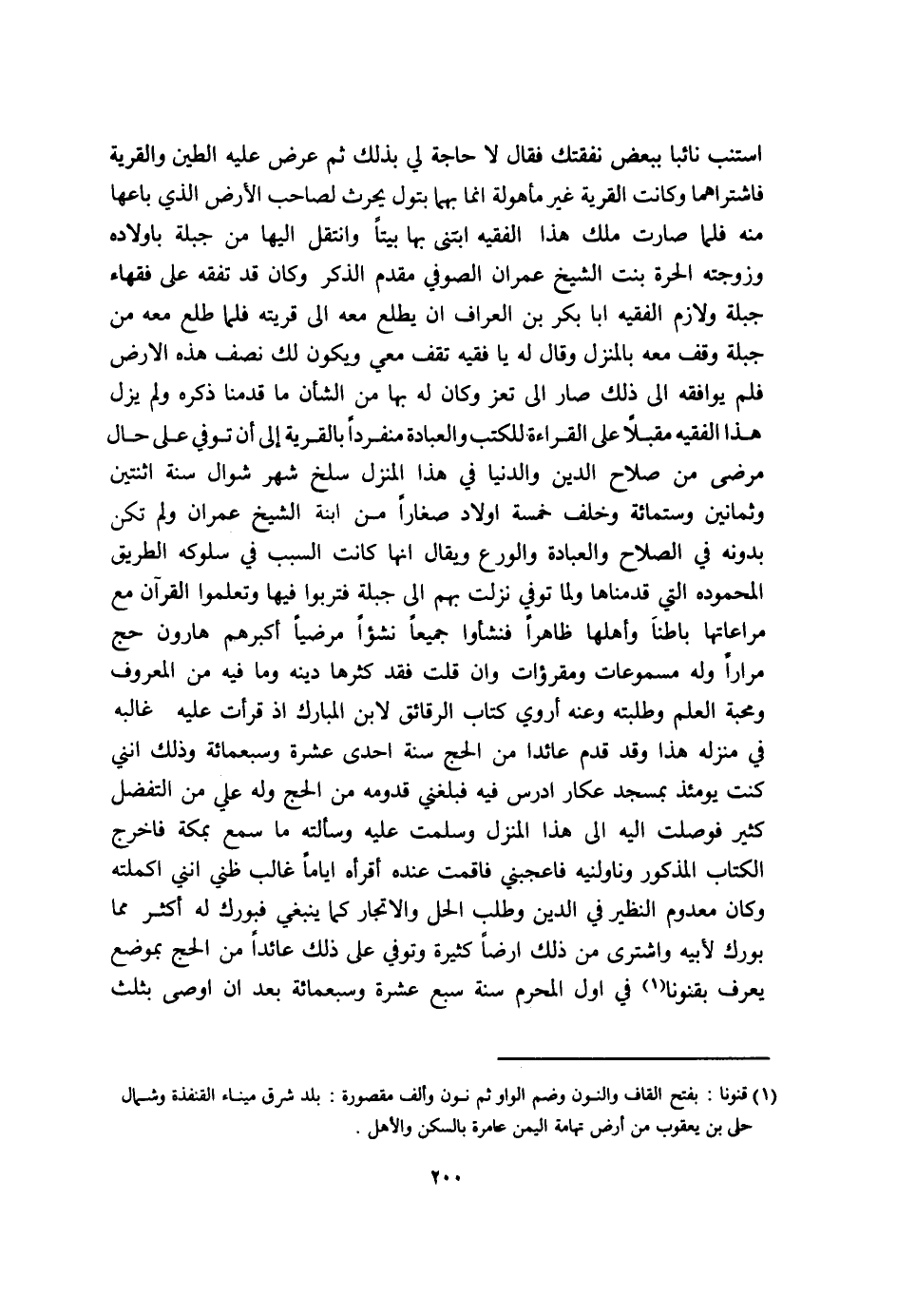 استنب نَائِبا بِبَعْض نَفَقَتك فَقَالَ لَا حَاجَة لي بذلك ثمَّ عرض عَلَيْهِ الطين والقرية فاشتراهما وَكَانَت الْقرْيَة غير مأهولة إِنَّمَا بهما بتول يحرث لصَاحب الأَرْض الَّذِي بَاعهَا مِنْهُ فَلَمَّا صَارَت ملك هَذَا الْفَقِيه ابتنى بهَا بَيْتا وانتقل اليها من جبلة باولاده وَزَوجته الْحرَّة بنت الشَّيْخ عمرَان الصُّوفِي مقدم الذّكر وَكَانَ قد تفقه على فُقَهَاء جبلة ولازم الْفَقِيه ابا بكر بن العراف ان يطلع مَعَه إِلَى قريته فَلَمَّا طلع مَعَه من جبلة وقف مَعَه بالمنزل وَقَالَ لَهُ يَا فَقِيه تقف معي وَيكون لَك نصف هَذِه الأَرْض فَلم يُوَافقهُ الى ذَلِك صَار الى تعز وَكَانَ لَهُ بهَا من الشَّأْن مَا قدمنَا ذكره وَلم يزل هَذَا الْفَقِيه مُقبلا على الْقِرَاءَة للكتب وَالْعِبَادَة مُنْفَردا بالقرية إِلَى أَن توفّي على حَال مرضى من صَلَاح الدّين وَالدُّنْيَا فِي هَذَا الْمنزل سلخ شهر شَوَّال سنة أثنتين وَثَمَانِينَ وسِتمِائَة وَخلف خَمْسَة اولاد صغَارًا من ابْنة الشَّيْخ عمرَان وَلم تكن بِدُونِهِ فِي الصّلاح وَالْعِبَادَة والورع وَيُقَال انها كَانَت السَّبَب فِي سلوكه الطَّرِيق المحموده الَّتِي قدمناها وَلما توفّي نزلت بهم الى جبلة فتربوا فِيهَا وتعلموا الْقُرْآن مَعَ مراعاتها بَاطِنا وَأَهْلهَا ظَاهرا فنشأوا جَمِيعًا نشؤا مرضيا أكبرهم هَارُون حج مرَارًا وَله مسموعات ومقرؤات وان قلت فقد كثرها دينه وَمَا فِيهِ من الْمَعْرُوف ومحبة الْعلم وطلبته وَعنهُ اروي كتاب الرَّقَائِق لِابْنِ الْمُبَارك اذ قَرَأت عَلَيْهِ غالبة فِي منزله هَذَا وَقد قدم عَائِدًا من الْحَج سنة احدى عشرَة وَسَبْعمائة وَذَلِكَ انني كنت يَوْمئِذٍ بِمَسْجِد عكار ادرس فِيهِ فبلغني قدومه من الْحَج وَله عَليّ من التفضل كثير فوصلت اليه الى هَذَا الْمنزل وسلمت عَلَيْهِ وَسَأَلته مَا سمع بِمَكَّة فَاخْرُج الْكتاب الْمَذْكُور وناولنيه فاعجبني فاقمت عِنْده أقراه أَيَّامًا غَالب ظَنِّي انني أكملته وَكَانَ مَعْدُوم النظير فِي الدّين وَطلب الْحل والاتجار كَمَا يَنْبَغِي فبورك لَهُ أَكثر مِمَّا بورك لِأَبِيهِ وَاشْترى من ذَلِك ارضا كَثِيرَة وَتُوفِّي على ذَلِك عَائِدًا من الْحَج بِموضع يعرف بقنونا فِي أول الْمحرم سنة سبع عشرَة وَسَبْعمائة بعد ان اوصى بِثلث