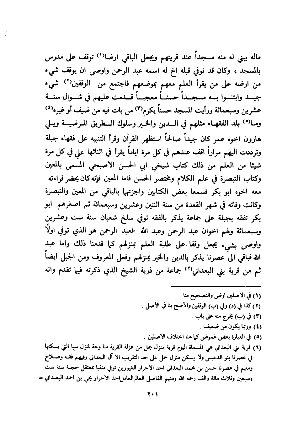مَاله يَبْنِي لَهُ مِنْهُ مَسْجِدا عِنْد قريتهم وَيجْعَل الْبَاقِي ارضا توقف على مدرس بِالْمَسْجِدِ وَكَانَ قد توفّي قبله اخ لَهُ اسْمه عبد الرَّحْمَن واوصى ان يُوقف شَيْء من ارضه على من يقْرَأ الْعلم مَعَهم بموضعهم فَاجْتمع من الوقفين شَيْء جيد وابتنوا بِهِ مَسْجِدا حسنا معجبا قدمت عَلَيْهِم فِي شَوَّال سنة عشْرين وَسَبْعمائة وَرَأَيْت الْمَسْجِد حسنا يكرم من بَات فِيهِ من ضيف أَو غَيره وَمَا بلد الْفُقَهَاء مثلهم فِي الدّين وَالْخَيْر وسلوك الطَّرِيق المرضية ويلي هَارُون اخوه عمر كَانَ جيدا صَالحا استظهر الْقُرْآن وَقَرَأَ التَّنْبِيه على فُقَهَاء جبلة وترددت اليهم مرَارًا اقف عِنْدهم فِي كل مرّة اياما يقْرَأ فِي اثنائها على فِي كل مرّة شَيْئا من الْعلم من ذَلِك كتاب شَيْخي ابي الْحسن الاصبحي الْمُسَمّى بالمعين وَكتاب التَّبْصِرَة فِي علم الْكَلَام ومختصر الْحسن فاما الْمعِين فَإِنَّهُ كَانَ يحضر قِرَاءَته مَعَه اخوه ابو بكر فسمعا بعض الكلتابين واجزتهما بِالْبَاقِي من الْمعِين والتبصرة وَكَانَت وَفَاته فِي شهر الْقعدَة من سنة اثْنَتَيْنِ وَعشْرين وَسَبْعمائة ثمَّ اصغرهم ابو بكر تفقه بجبلة على جمَاعَة يذكر بالفقه توفّي سلخ شعْبَان سنة سِتّ وَعشْرين وَسَبْعمائة وَلَهُم اخوان عبد الرَّحْمَن وَعبد الله فعبد الرَّحْمَن هُوَ الَّذِي توفّي اولا واوصى بِشَيْء يَجْعَل وَقفا على طلبة الْعلم بمنزلهم كَمَا قدمنَا ذَلِك واما عبد الله فباقي الى عصرنا يذكر بِالدّينِ وَالْخَيْر بمنزلهم وَفعل الْمَعْرُوف وَمن الْجَبَل ايضا ثمَّ من قَرْيَة بني البعداني جمَاعَة من ذُرِّيَّة الشَّيْخ الَّذِي ذكرته فِيمَا تقدم وانه
