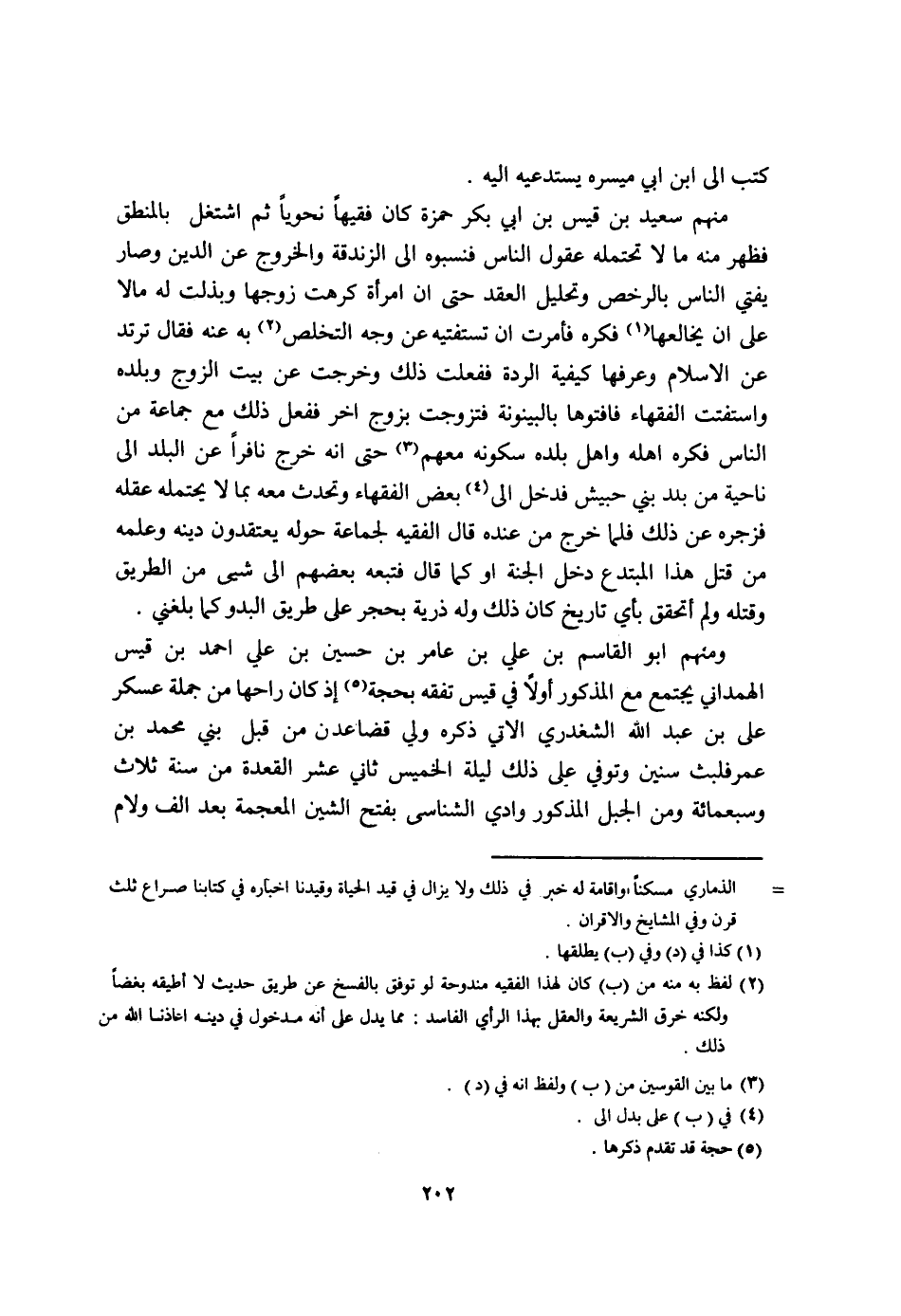 مِنْهُم سعيد بن قيس بن ابي بكر حَمْزَة كَانَ فَقِيها نحويا ثمَّ اشْتغل بالْمَنْطق فَظهر مِنْهُ مَا لَا تحتمله عقول النَّاس فنسبوه الى الزندقة وَالْخُرُوج عَن الدّين وَصَارَ يُفْتِي النَّاس بالرخص وَتَحْلِيل العقد حَتَّى ان امْرَأَة كرهت زَوجهَا وبذلت لَهُ مَالا على ان يخالعها فكره فَأمرت ان تستفتيه عَن وَجه التَّخَلُّص بِهِ عَنهُ فَقَالَ ترتد عَن الاسلام وَعرفهَا كَيْفيَّة الرِّدَّة فَفعلت ذَلِك وَخرجت عَن بَيت الزَّوْج وبلده واستفنت الْفُقَهَاء فافتوها بالبينونة فَتزوّجت بِزَوْج اخر فَفعل ذَلِك مَعَ جمَاعَة من النَّاس فكره اهله واهل بَلَده سكونه مَعَهم حَتَّى انه خرج نافرا عَن الْبَلَد الى نَاحيَة من بلد بني حُبَيْش فَدخل الى بعض الْفُقَهَاء وتحدث مَعَه بمالا يحْتَملهُ عقله فزجره عَن ذَلِك فَلَمَّا خرج من عِنْده قَالَ الْفَقِيه لجَماعَة حوله يَعْتَقِدُونَ دينه وَعلمه من قتل هَذَا المبتدع دخل الْجنَّة اَوْ كَمَا قَالَ فَتَبِعَهُ بَعضهم الى شَيْء من الطَّرِيق وَقَتله وَلم اتحقق بِأَيّ تَارِيخ كَانَ ذَلِك وَله ذُرِّيَّة بِحجر على طَرِيق البدو كَمَا بَلغنِي