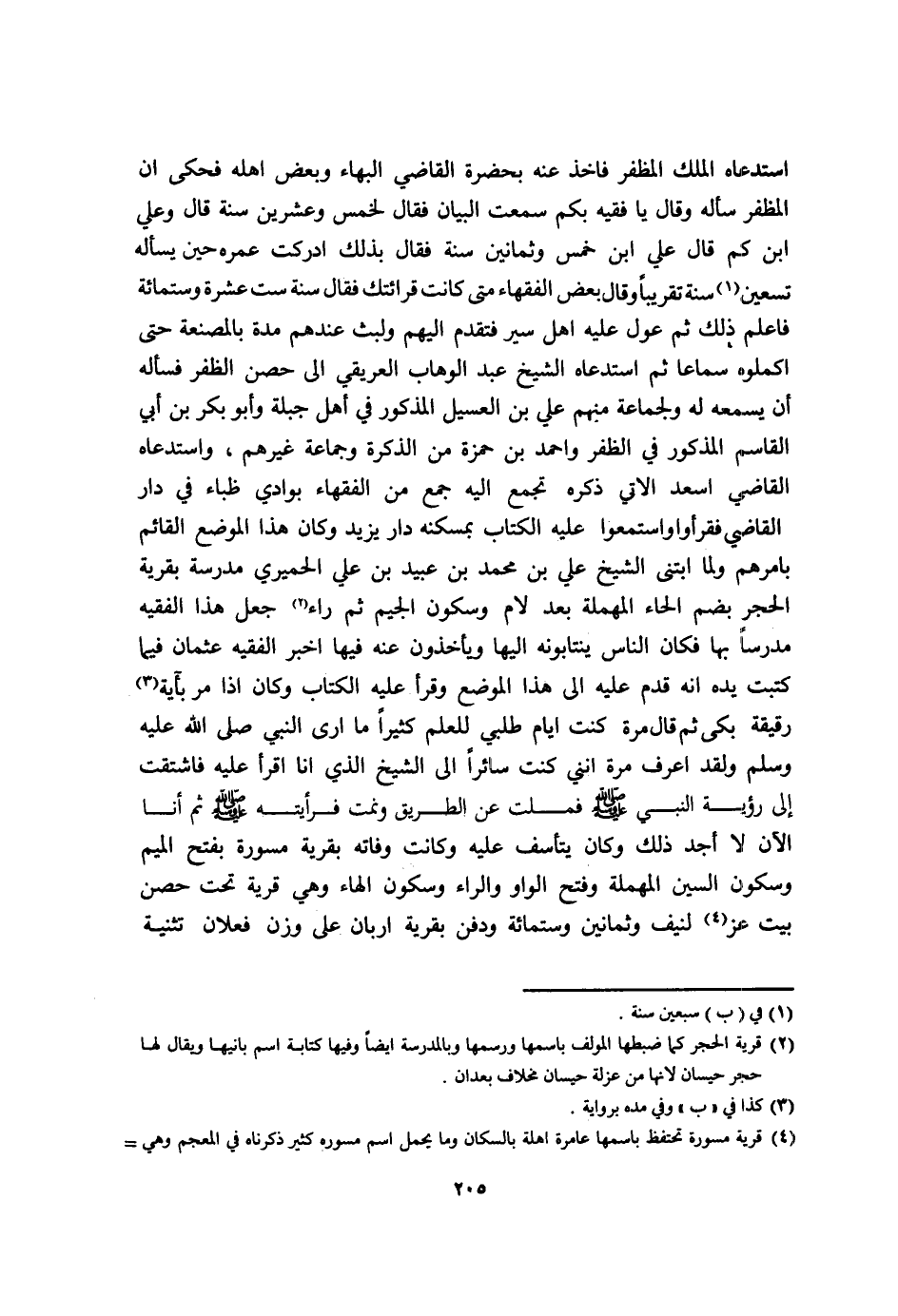 استدعاه الْملك المظفر فاخذ عَنهُ بِحَضْرَة القَاضِي الْبَهَاء وَبَعض اهله فَحكى ان المظفر سَأَلَهُ وَقَالَ يَا فَقِيه بكم سَمِعت الْبَيَان فَقَالَ لخمس وَعشْرين سنة قَالَ وَعلي ابْن كم قَالَ عَليّ ابْن خمس وَثَمَانِينَ سنة فَقَالَ بذلك ادركت عمره حِين يسْأَله تسعين سنة تَقْرِيبًا وَقَالَ بعض الْفُقَهَاء مَتى كات قرائتك فَقَالَ سنة سِتّ عشرَة وسِتمِائَة فَاعْلَم ذَلِك ثمَّ عول عَلَيْهِ اهل سير فَتقدم اليهم ولبث عِنْدهم مُدَّة بالمصنعة حَتَّى اكملوه سَمَاعا ثمَّ استدعاه الشَّيْخ عبد الْوَهَّاب العريقي الى حصن الظفر فَسَأَلَهُ أَن يسمعهُ لَهُ ولجماعة مِنْهُم عَليّ بن العسيل الْمَذْكُور فِي أهل جبلة وَأَبُو بكر بن أبي الْقَاسِم الْمَذْكُور فِي الظفر وَأحمد بن حَمْزَة من الذكرة وَجَمَاعَة غَيرهم واستدعاه القَاضِي اِسْعَدْ الَّاتِي ذكره تجمع اليه جمع من الْفُقَهَاء بوادي ظباء فِي دَار القَاضِي فقرأوا وَاسْتَمعُوا عَلَيْهِ الْكتاب بمسكنه دَار يزِيد وَكَانَ هَذَا الْموضع الْقَائِم بامرهم وَلما ابتنى الشَّيْخ عَليّ بن مُحَمَّد بن عبيد بن عَليّ الْحِمْيَرِي مدرسة بقرية الْحجر بِضَم الْحَاء الْمُهْملَة بعد لَام وَسُكُون الْجِيم ثمَّ رَاء جعل هَذَا الْفَقِيه مدرسا بهَا فَكَانَ النَّاس ينتابونه اليها وَيَأْخُذُونَ عَنهُ فِيهَا اخبر الْفَقِيه عُثْمَان فِيمَا كتبت يَده انه قدم عَلَيْهِ الى هَذَا الْموضع وَقَرَأَ عَلَيْهِ الْكتاب وَكَانَ اذا مر بِآيَة رقيقَة بَكَى ثمَّ قَالَ مرّة كنت ايام طلبي للْعلم كثيرا مَا ارى النَّبِي صلى الله عَلَيْهِ وَسلم وَلَقَد اعرف مرّة انني كنت سائرا الى الشَّيْخ الَّذِي انا اقْرَأ عَلَيْهِ فاشتقت إِلَى رُؤْيَة النَّبِي صلى الله عَلَيْهِ وَسلم فملت عَن الطَّرِيق ونمت فرأيته صلى الله عَلَيْهِ وَسلم ثمَّ أَنا الْآن لَا أجد ذَلِك وَكَانَ يتاسف عَلَيْهِ كَانَت وَفَاتَ بقرية مسورة بِفَتْح الْمِيم وَسُكُون السِّين الْمُهْملَة وَفتح الْوَاو وَالرَّاء وَسُكُون الْهَاء وَهِي قَرْيَة تَحت حصن بَيت عز لنيف وَثَمَانِينَ وسِتمِائَة وَدفن بقرية اربان على وزن فعلان تَثْنِيَة