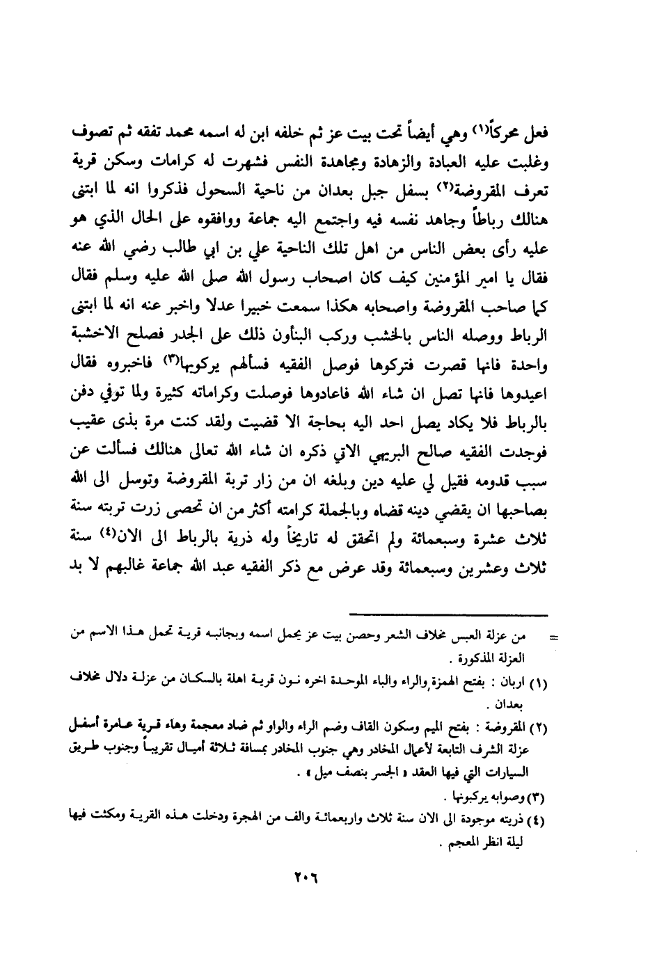 فعل محركا وَهِي أَيْضا تَحت بَيت عز ثمَّ خَلفه ابْن لَهُ اسْمه مُحَمَّد تفقه ثمَّ تصوف وغلبت عَلَيْهِ الْعِبَادَة والزهادة ومجاهدة النَّفس فشهرت لَهُ كرامات وَسكن قَرْيَة تعرف المقروضة بسفل جبل بعدان من نَاحيَة السحول فَذكرُوا انه لما ابتنى هُنَالك رِبَاطًا وجاهد نَفسه فِيهِ وَاجْتمعَ اليه جمَاعَة ووافقوه على الْحَال الَّذِي هُوَ عَلَيْهِ رأيى بعض النَّاس من اهل تِلْكَ النَّاحِيَة عَليّ بن ابي طَالب رَضِي الله عَنهُ فَقَالَ يَا أَمِير الْمُؤمنِينَ كَيفَ كَانَ اصحاب رَسُول الله صلى الله عَلَيْهِ وَسلم فَقَالَ كَمَا صَاحب المقررضة وَأَصْحَابه هَكَذَا سَمِعت خَبِيرا عدلا وَاخْبَرْ عَنهُ انه لما ابتنى الرِّبَاط وَوَصله النَّاس بالخشب وَركب البنأون ذَلِك على الْجدر فصلح الاخشبة وَاحِدَة فَإِنَّهَا قصرت فتركوها فوصل الْفَقِيه فسالهم يركوبها فاخبروه فَقَالَ اعيدوها فانها تصل ان شَاءَ الله فاعادوها فوصلت وكراماته كَثِيرَة وَلما توفّي دفن بالرباط فَلَا يكَاد يصل اُحْدُ اليه بحاجة الا قضيت وَلَقَد كنت مرّة بذى عقيب فَوجدت الْفَقِيه صَالح البريهي الَّاتِي ذكره ان شَاءَ الله تَعَالَى هُنَالك فَسَأَلت عَن سَبَب قدومه فَقيل لي عَلَيْهِ دين وبلغه ان من زار تربة المقروضة وتوسل الى الله بصاحبها ان يقْضِي دينه قَضَاهُ وَبِالْجُمْلَةِ كرامته اكثر من ان تحصى زرت تربته سنة ثَلَاث عشرَة وَسَبْعمائة وَلم اتحقق لَهُ تَارِيخا وَله ذُرِّيَّة بالرباط الى الان سنة ثَلَاث وَعشْرين وَسَبْعمائة وَقد عرض مَعَ ذكر الْفَقِيه عبد الله جمَاعَة غالبهم لَا بُد