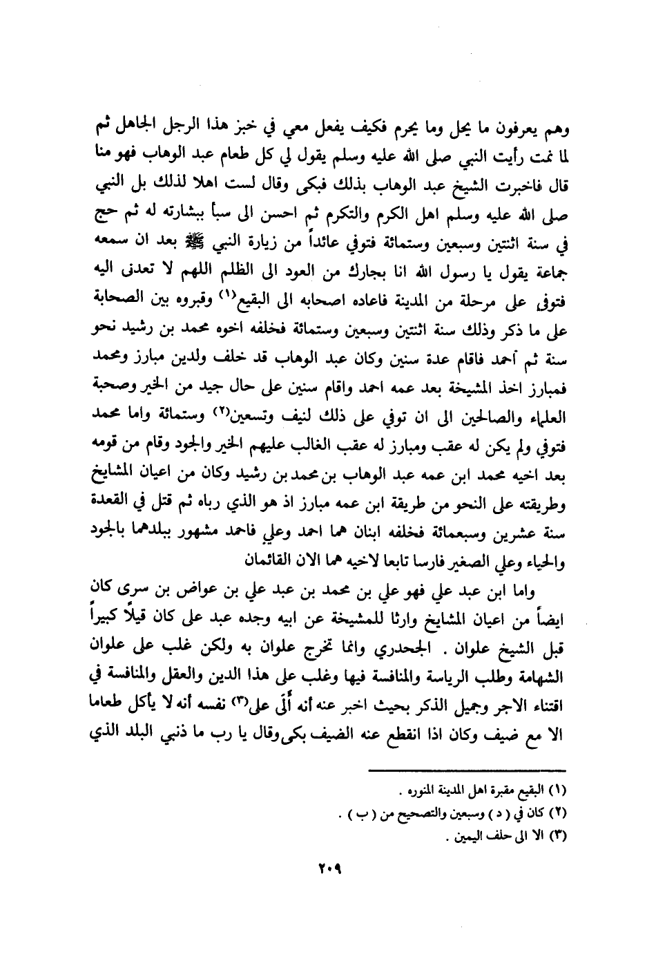 وهم يعْرفُونَ مَا يحل وَمَا يحرم فَكيف يفعل معي فِي خبز هَذَا الرجل الْجَاهِل ثمَّ لما نمت رَأَيْت النَّبِي صلى الله عَلَيْهِ وَسلم يَقُول لي كل طَعَام عبد الْوَهَّاب فَهُوَ منا قَالَ فاخبرت الشَّيْخ عبد الْوَهَّاب بذلك فَبكى وَقَالَ لست اهلا لذَلِك بل النَّبِي صلى الله عَلَيْهِ وَسلم اهل الْكَرم والتكرم ثمَّ احسن الى سبأ ببشارته لَهُ ثمَّ حج فِي سنة اثْنَتَيْنِ وَسبعين وسِتمِائَة فَتوفي عَائِدًا من زِيَارَة النَّبِي صلى الله عَلَيْهِ وَسلم بعد ان سَمعه جمَاعَة يَقُول يَا رَسُول الله انا بجارك من الْعود الى الظُّلم اللَّهُمَّ لَا تعدني اليه فتوفى على مرحلة من الْمَدِينَة فاعاده اصحابه الى البقيع وقبروه بَين الصَّحَابَة على مَا ذكر وَذَلِكَ سنة اثْنَتَيْنِ وَسبعين وسِتمِائَة فخلفه اخوه مُحَمَّد بن رشيد نَحْو سنة ثمَّ أَحْمد فاقام عدَّة سِنِين وَكَانَ عبد الْوَهَّاب قد خلف وَلدين مبارز وَمُحَمّد فمبارز اخذ المشيخة بعد عَمه احْمَد وَقَامَ سِنِين على حَال جيد من الْخَيْر وصحبة الْعلمَاء وَالصَّالِحِينَ الى ان توفّي على ذَلِك لنيف وَتِسْعين وسِتمِائَة واما مُحَمَّد فَتوفي وَلم يكن لَهُ عقب ومبارز لَهُ عقب الْغَالِب عَلَيْهِم الْخَيْر والجود وَقَامَ من قومه بعد اخيه مُحَمَّد ابْن عَمه عبد الْوَهَّاب بن مُحَمَّد بن رشيد وَكَانَ من اعيان الشايخ وطريقته على النَّحْو من طَريقَة ابْن عَمه مبارز اذ هُوَ الَّذِي رباه ثمَّ قتل فِي الْقعدَة سنة عشْرين وَسَبْعمائة فخلفه ابْنَانِ هما احْمَد وَعلي فاحمد مَشْهُور ببلدهما بالجود وَالْحيَاء وَعلي الصَّغِير فَارِسًا تَابعا لاخيه هما الان القائمان