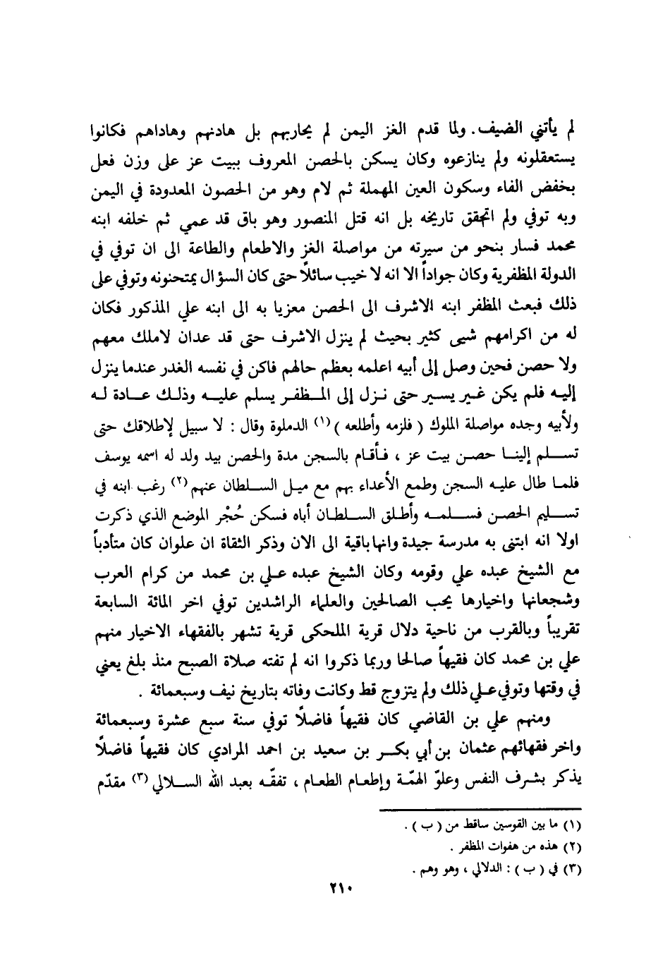 وَلما قدم الغز الْيمن لم يحاربهم بل هادنهم وهاداهم فَكَانُوا يستعقلونه وَلم ينازعوه وَكَانَ يسكن بالحصن الْمَعْرُوف بِبَيْت عز على وزن فعل بخفض الْفَاء وَسُكُون الْعين الْمُهْملَة ثمَّ لَام وَهُوَ من الْحُصُون المعدودة فِي الْيمن وَبِه توفّي وَلم اتحقق تَارِيخه بل انه قتل الْمَنْصُور وَهُوَ بَاقٍ قد عمي ثمَّ خَلفه ابْنه مُحَمَّد فَسَار بِنَحْوِ من سيرته من مُوَاصلَة الغز والاطعام وَالطَّاعَة الى ان توفّي فِي الدولة المظفرية وَكَانَ جوادا الا انه لَا خيب سَائِلًا حَتَّى كَانَ السُّؤَال يمتحنونه وَتُوفِّي على ذَلِك فَبعث المظفر بنه الاشرف الى الْحصن معزيا بِهِ الى ابْنه عَليّ الْمَذْكُور فَكَانَ لَهُ من اكرامهم شَيْء كثير بِحَيْثُ لم ينزل الاشرف حَتَّى قد عدان لاملك مَعَهم وَلَا حصن فحين وصل الى أَبِيه اعلمه بِعظم حَالهم فاكن فِي نَفسه الْغدر عِنْدَمَا ينرل إِلَيْهِ فَلم يكن غير يسير حَتَّى نزل إِلَى المظفر يسلم عَلَيْهِ وَذَلِكَ عَادَة لَهُ ولأبيه وجده مُوَاصلَة الْمُلُوك فَلَزِمَهُ وأطلعه الدملوة وَقَالَ لَا سَبِيل لإطلاقك حَتَّى تسلم إِلَيْنَا حصن بَيت عز فَأَقَامَ بالسجن مُدَّة والحصن بيد ولد لَهُ اسْمه يُوسُف فَلَمَّا طَال عَلَيْهِ السجْن وطمع الْأَعْدَاء بِهِ مَعَ ميل السُّلْطَان عَنْهُم رغب ابْنه فِي تَسْلِيم الْحصن فسلمه وَأطلق السُّلْطَان أَبَاهُ فسكن حجر الْموضع الَّذِي ذكرت اولا انه ابتنى بِهِ مدرسة جَيِّدَة وانها بَاقِيَة الى الان وَذكر الثقاة ان علوان كَانَ متأدبا مَعَ الشَّيْخ عَبده عَليّ وَقَومه وَكَانَ الشَّيْخ عَبده عَليّ بن مُحَمَّد من كرام الْعَرَب وشجعانها واخيارها يحب الصَّالِحين وَالْعُلَمَاء الرَّاشِدين توفّي اخر الْمِائَة السَّابِعَة تَقْرِيبًا وبالقرب من نَاحيَة دلال قَرْيَة الملحكي قَرْيَة تشهر بالفقهاء الاخيار مِنْهُم عَليّ بن مُحَمَّد كَانَ فَقِيها صَالحا وَرُبمَا ذكرُوا انه لم تفته صَلَاة الصُّبْح مُنْذُ بلغ يَعْنِي فِي وَقتهَا وَتُوفِّي عَليّ ذَلِك وَلم يتَزَوَّج قطّ وَكَانَت وَفَاته بتاريخ نَيف وسبعمائه